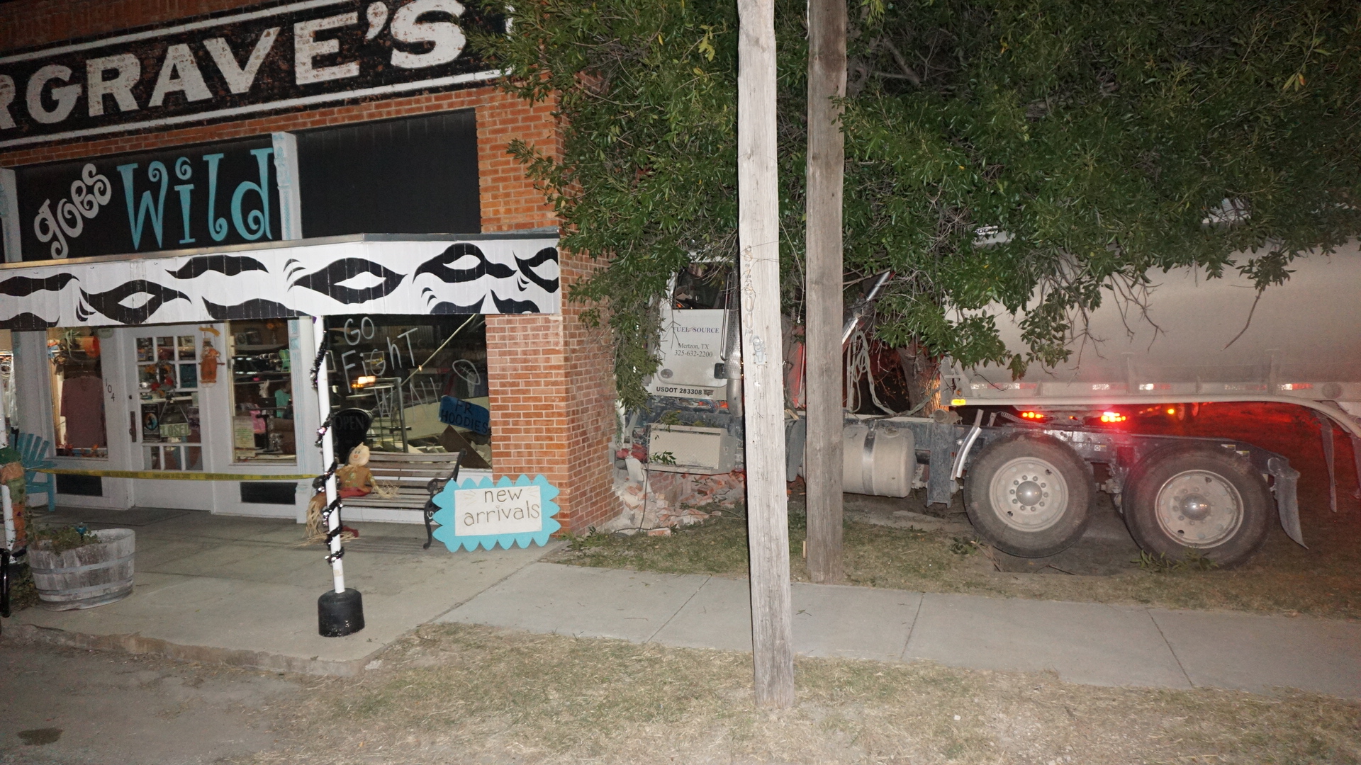 MERTZON, TX — A truck tractor towing a semi-trailer tank labeled “fuel” was driven into the side of a storefront in Mertzon late Saturday night. Irion County Sheriff’s Deputies and the Texas DPS were on the scene.