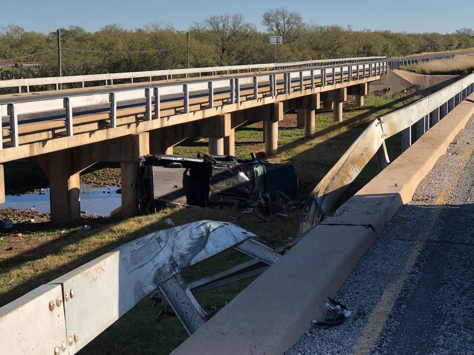 The truck was traveling northbound on US Highway 67 towards Miles when it crashed through a guardrail. The truck then rolled, crushing the roof.