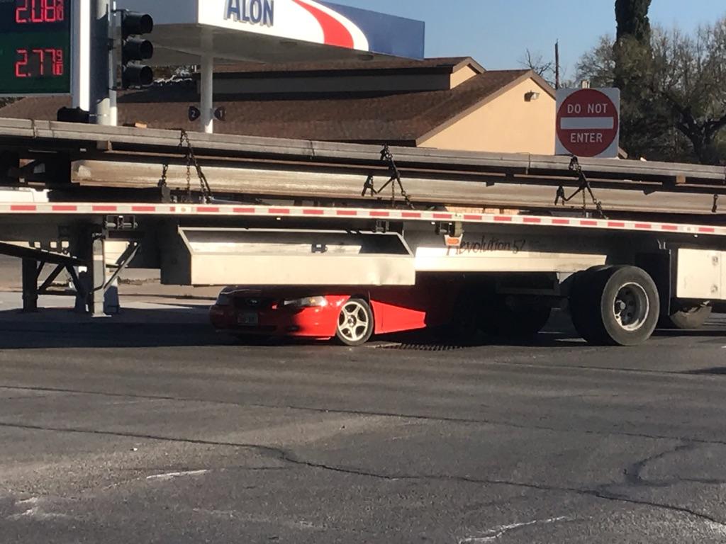A red 2005 Ford Mustang GT smashed into the underside a 2015 Freightliner that was trying to make a right turn on to Chadbourne.