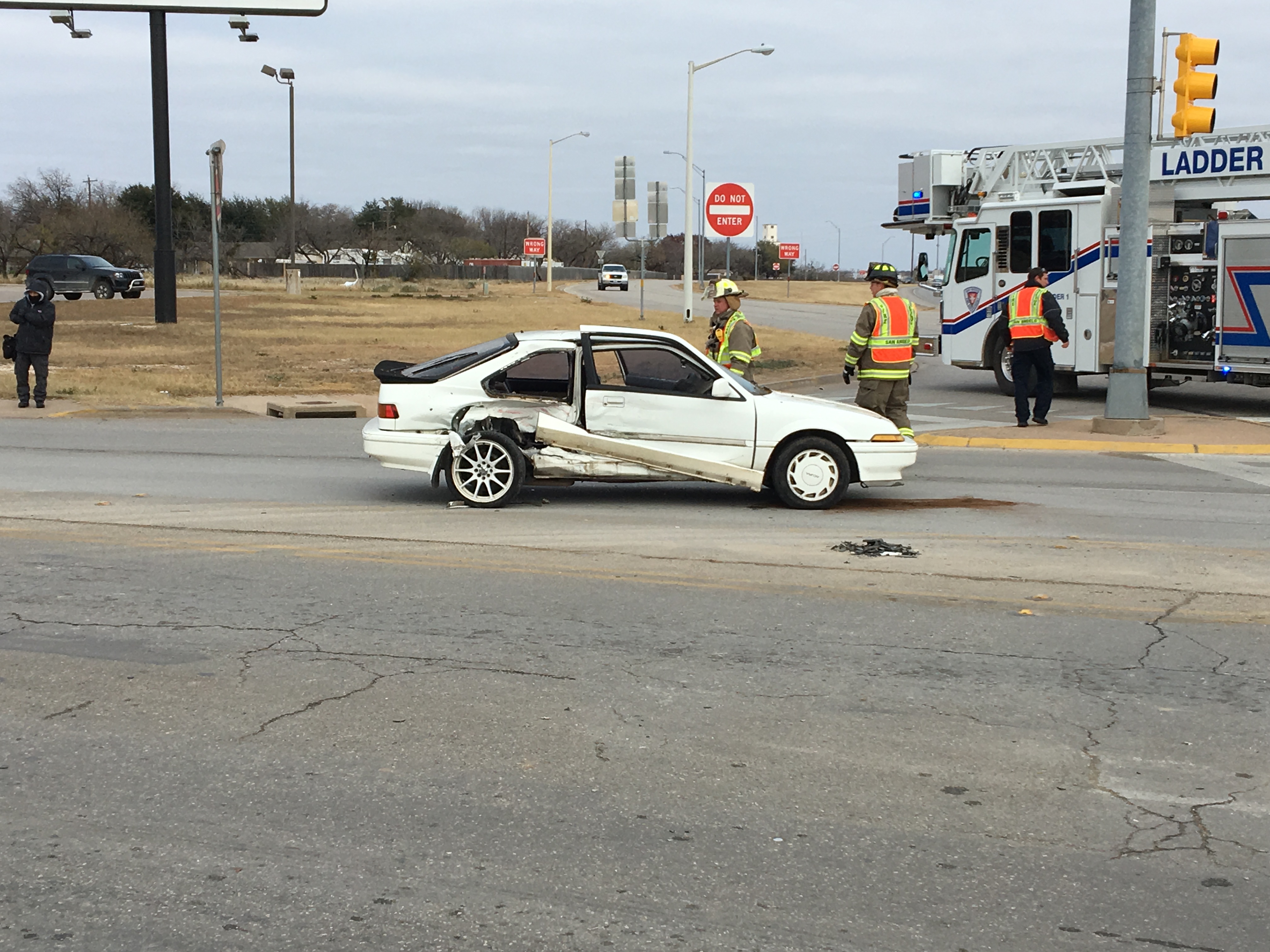 According to San Angelo police, the white passenger car (pictured) was northbound on Main St. when a westbound car on the access road to the Houston Harte Expy. ran the light and slammed into it. The white car spun around several times before coming to a rest in the middle of the roadway.
