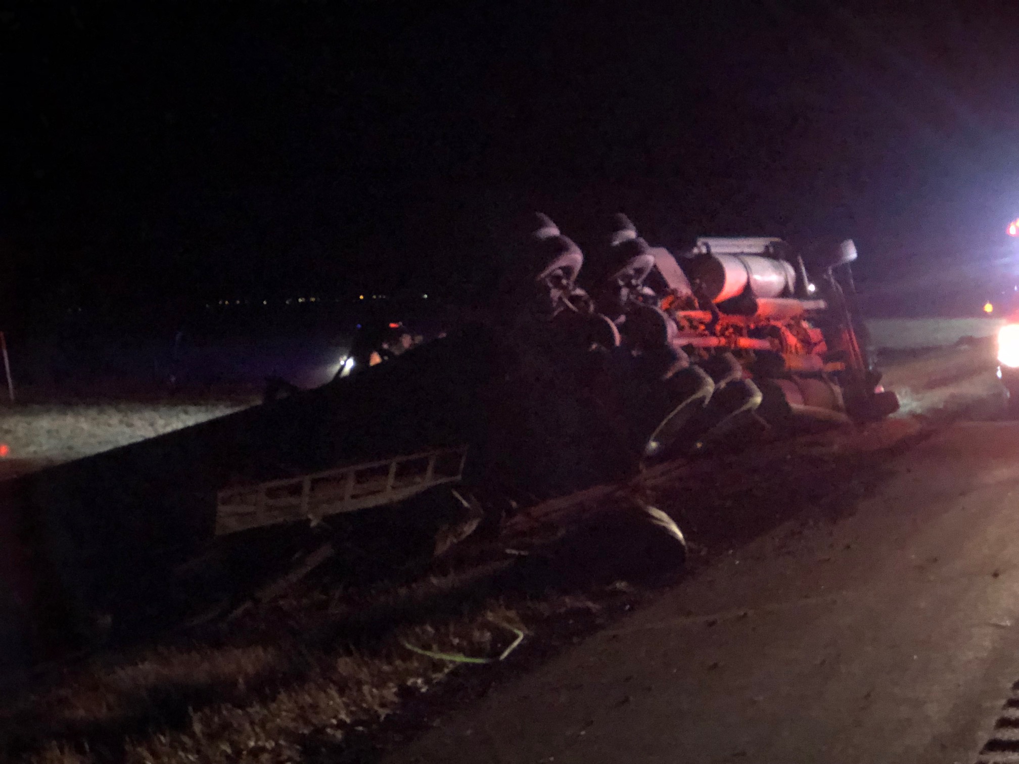 As the load was falling off to the side, the trailer pulled left, pushing the truck tractor right. The instability of the whole ordeal, coupled with highway speeds, sent the truck into a roll, where it came to a rest on its side.