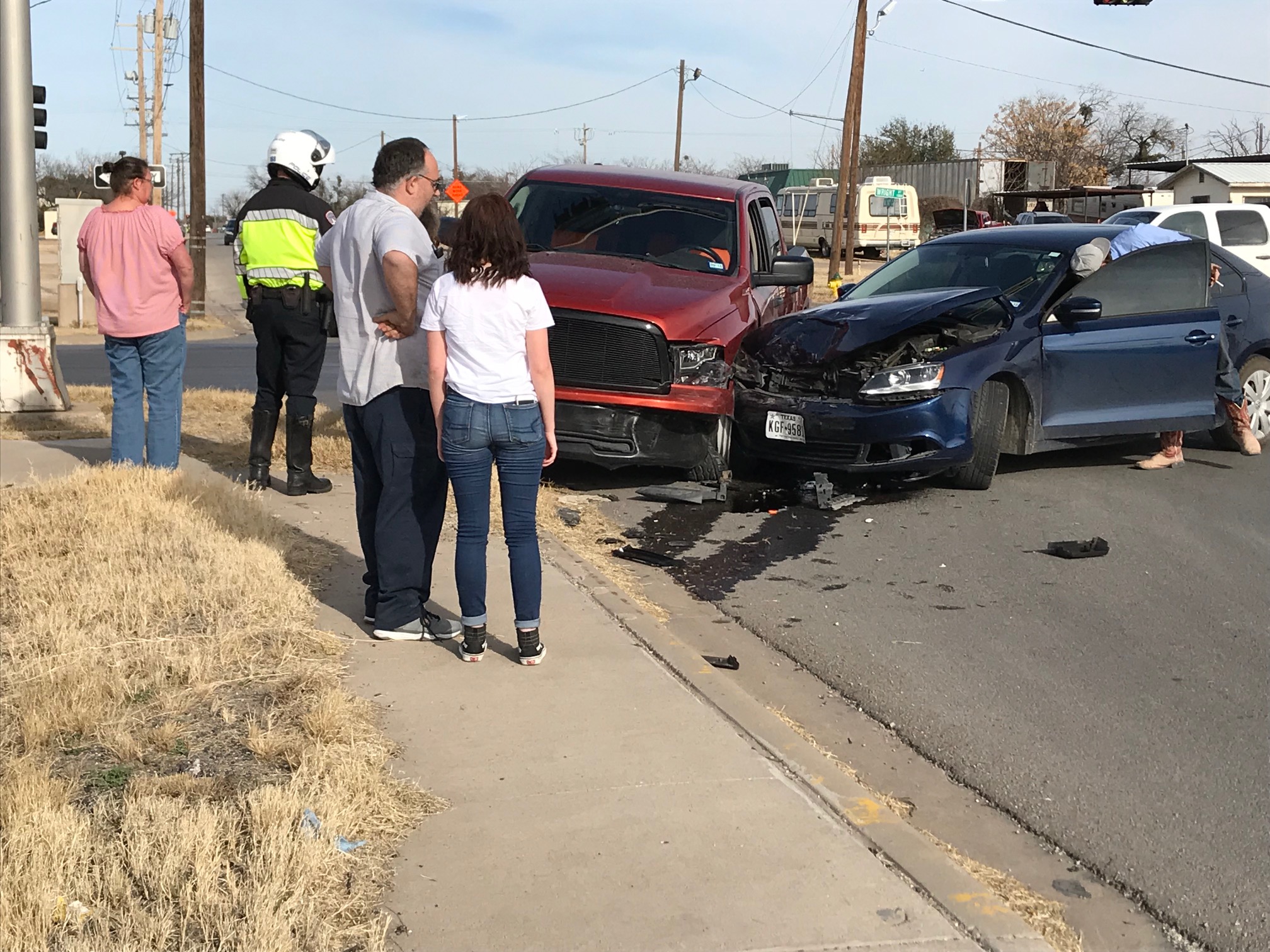 A blue Volkswagen Jetta collided with an orange Dodge Ram pickup truck at the intersection of 14th st. and North Bryant.