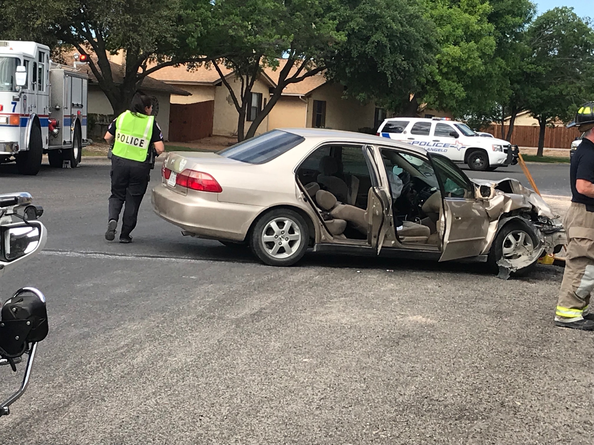 San Angelo Police Department investigating officer Bylsma said the driver of a tan 2000 Honda Accord was illegally using his cell phone when he swerved wide right while eastbound on Valley View and struck a white Dodge Challenger sending it up into a yard.