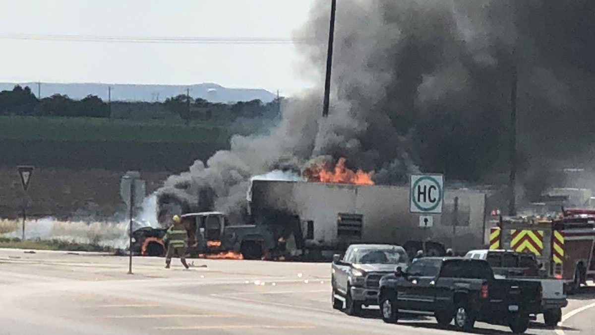 SAN ANGELO, TX — A dual cab pickup hauling a trailer burst into flames Thursday afternoon at the intersection of FM 1223 and S. Loop 306. The Tom Green County Sheriff’s Office said contents of the trailer are hazardous.