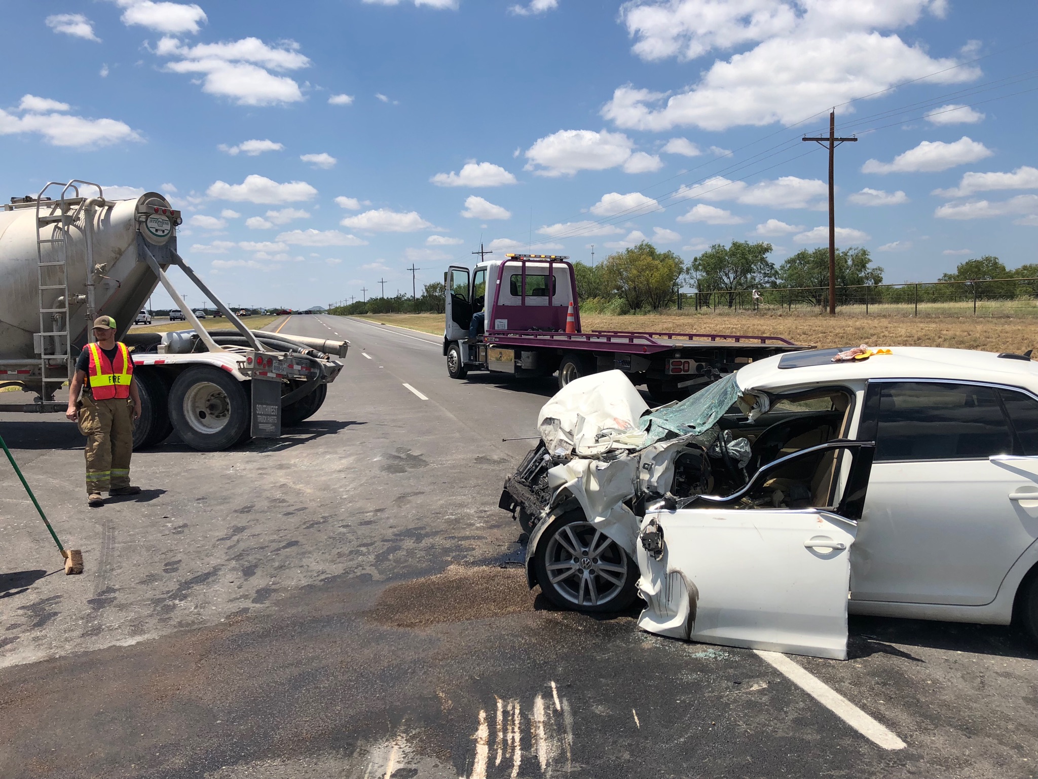 SAN ANGELO, TX -- The driver of a white Volkswagen four door sedan was seriously injured while crashing into the back of a sand hauling 18-wheeler near U.S. 87 North and Sharp Rd. between Grape Creek and Carlsbad.