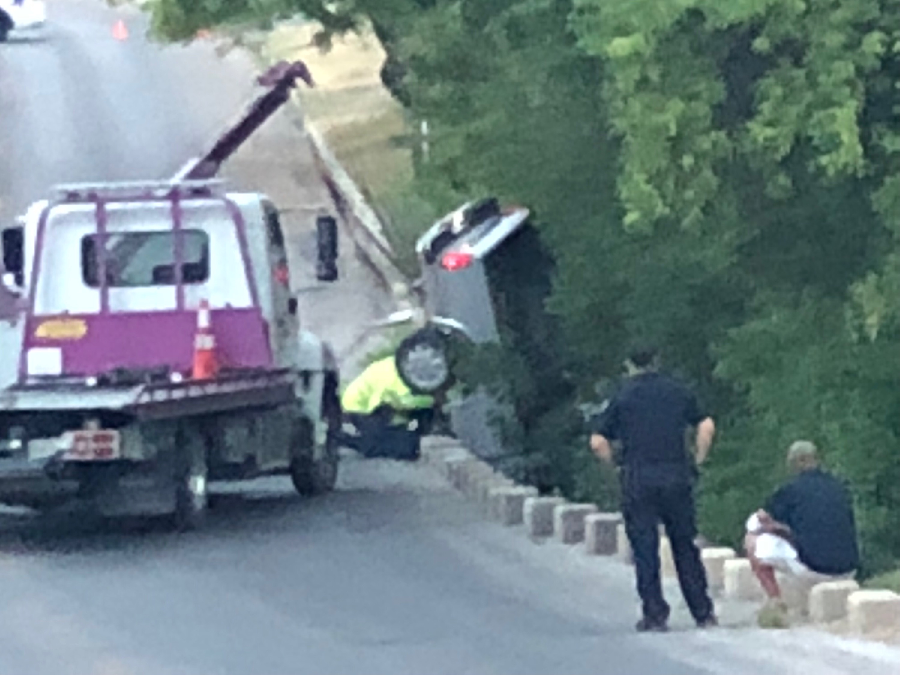 The driver swerved to avoid a crash and went off the low water crossing bridge coming to rest in the Concho River