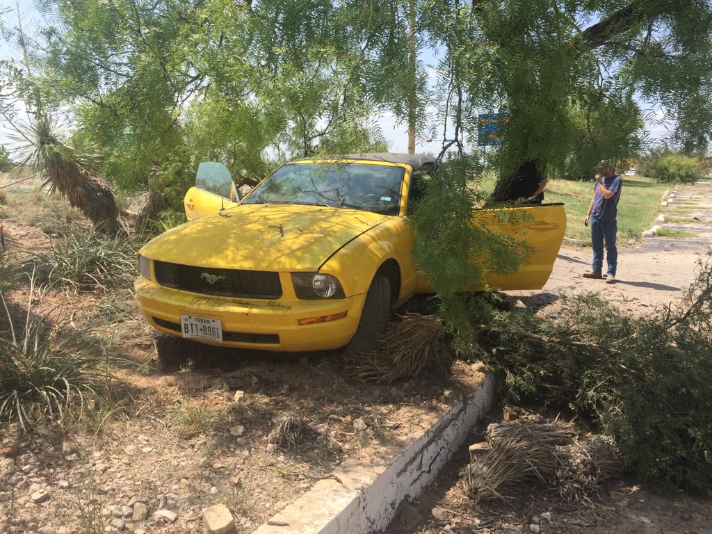 SAN ANGELO, TX -- The driver of a yellow Ford Mustang convertible escaped serious injury Monday afternoon after crashing and landing a mesquite tree.