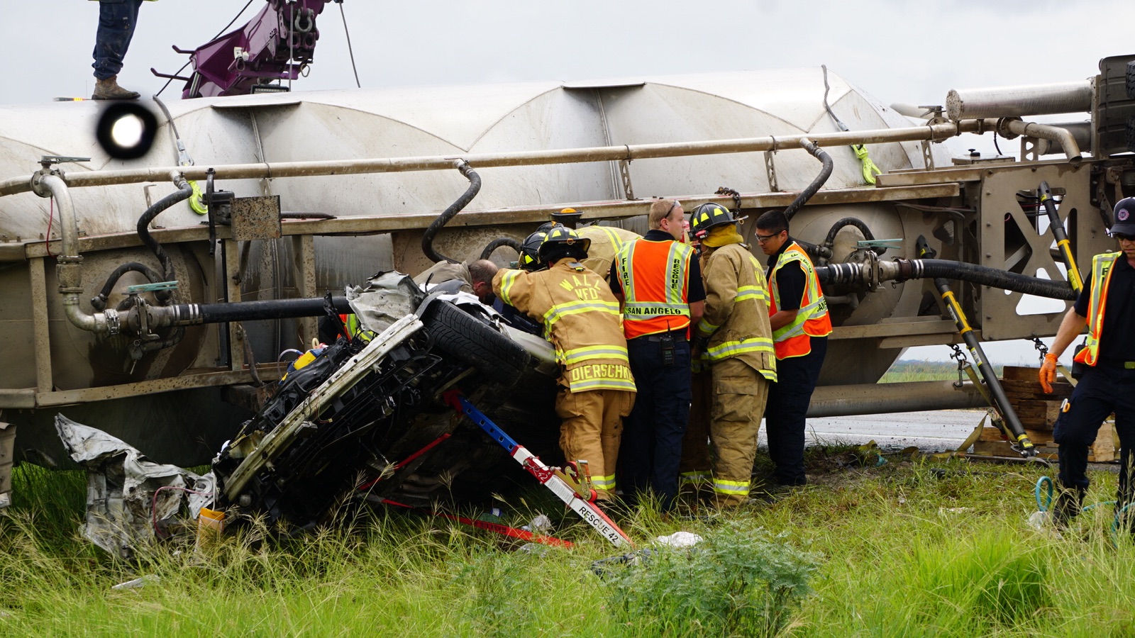 The BMW was crushed with the two occupants inside. DPS characterized their injuries as “incapacitating.” The trucker was treated at the scene and released.