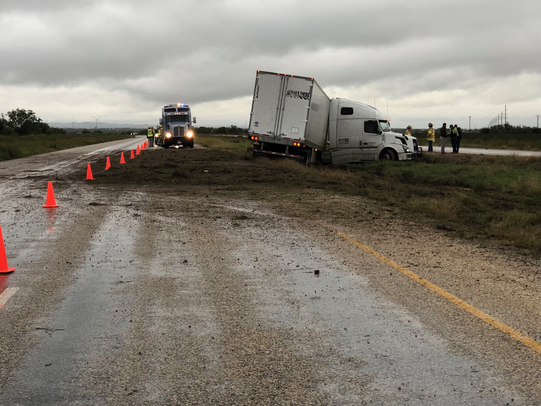 Wednesday evening an 18-wheeler slid off a rain soaked Loop 306 between the overpasses at FM 765 and FM 388.