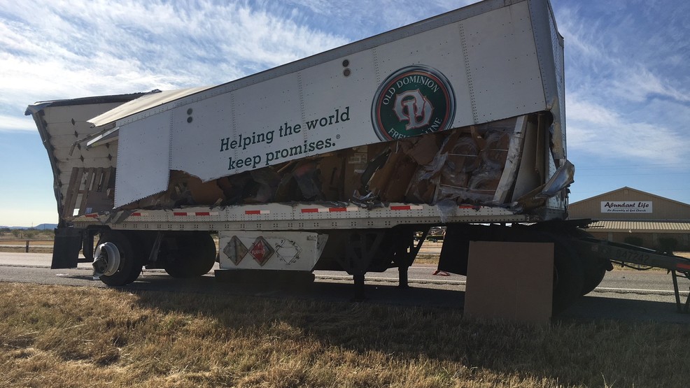 The trailer of one of the moving trucks was tore in half. There is still no word on if anyone was injured.