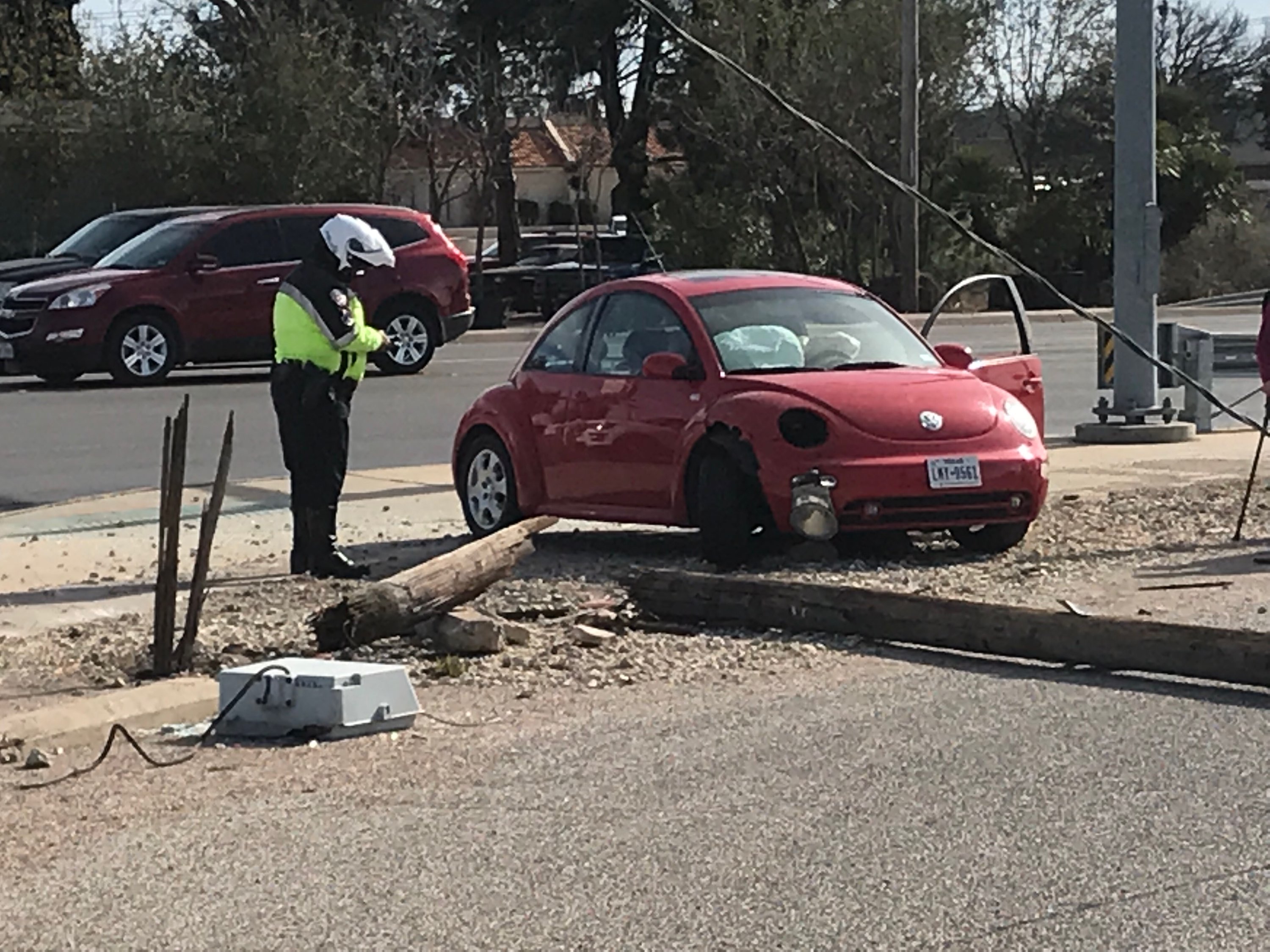 SAN ANGELO, TX -- A red Volkswagen Beetle crashed into a power pole at the intersection of Johnson St. and Knickerbocker Rd. Wed. afternoon.