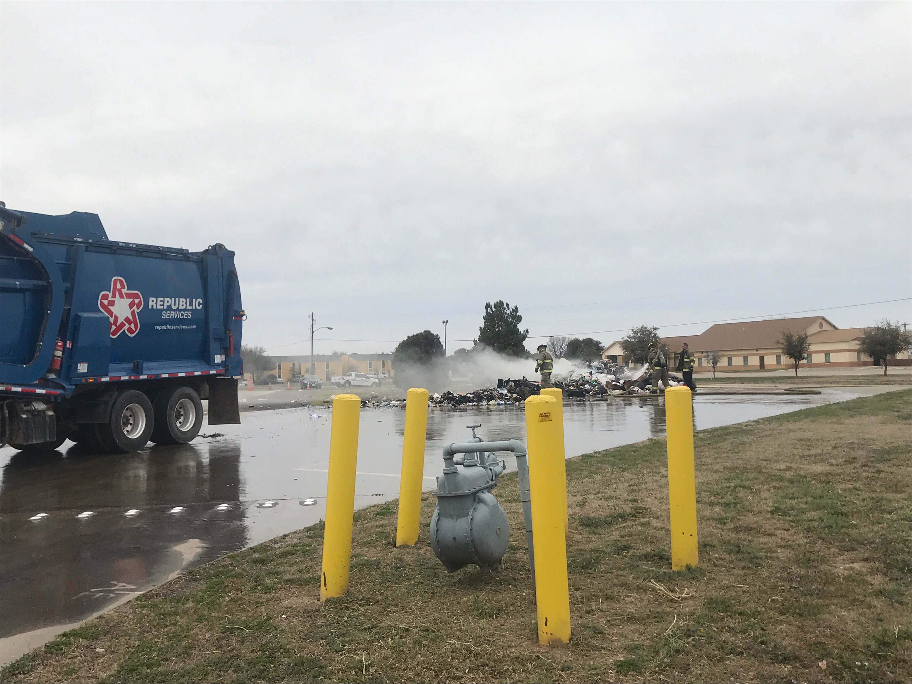 SAN ANGELO, TX -- San Angelo Firefighters and Police Officers responded to a fire call at the Texas Department of Public Safety office on Foster Rd. at Loop 306 Monday to douse a fire a Republic Services trash truck dumped in the parking lot.