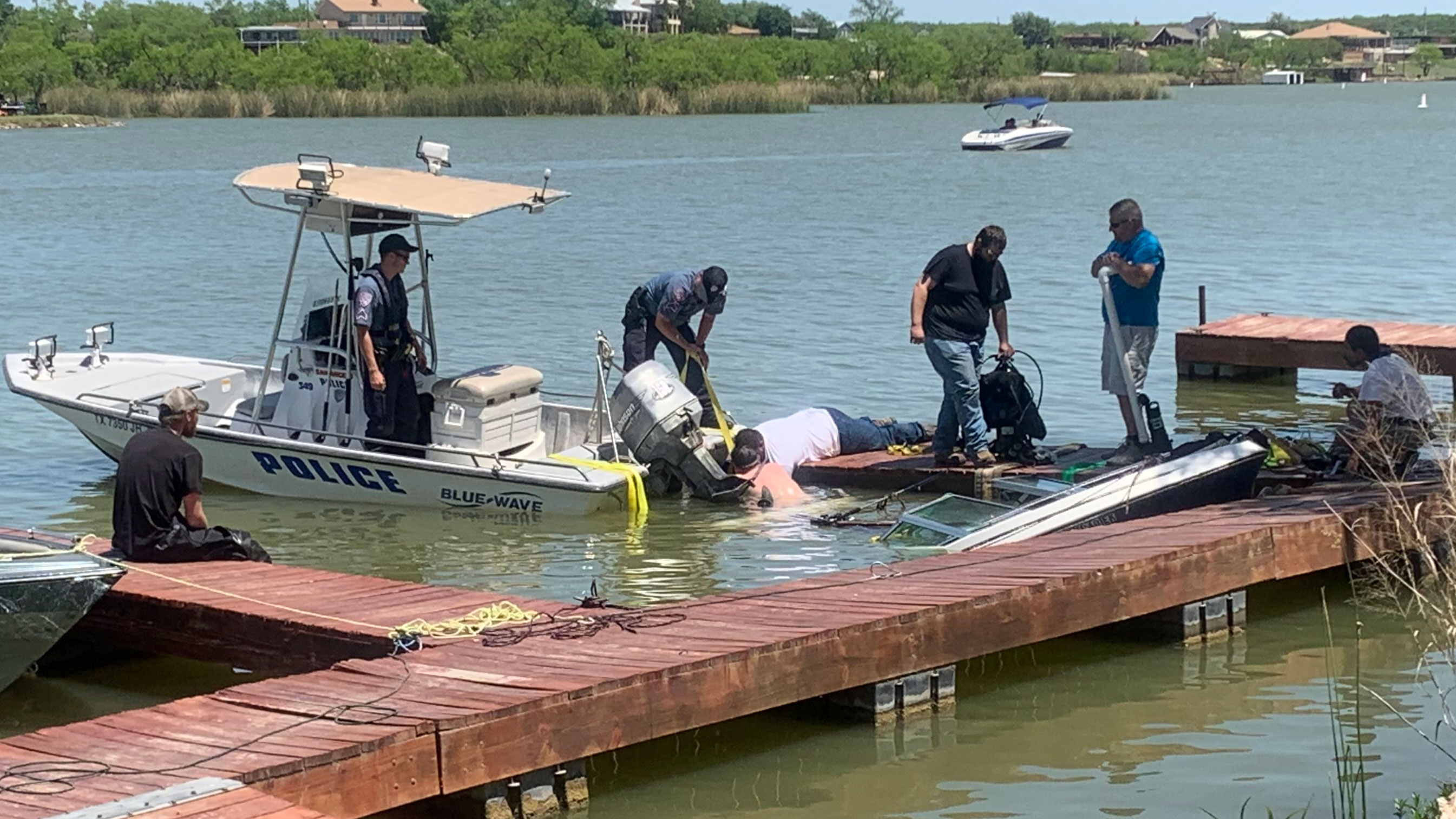 Authorities, including a diver with Lake Patrol, were looking for ways to salvage what looked like an older model ski boat. A Home Motors wrecker stood by at the ready in case other ideas failed.
