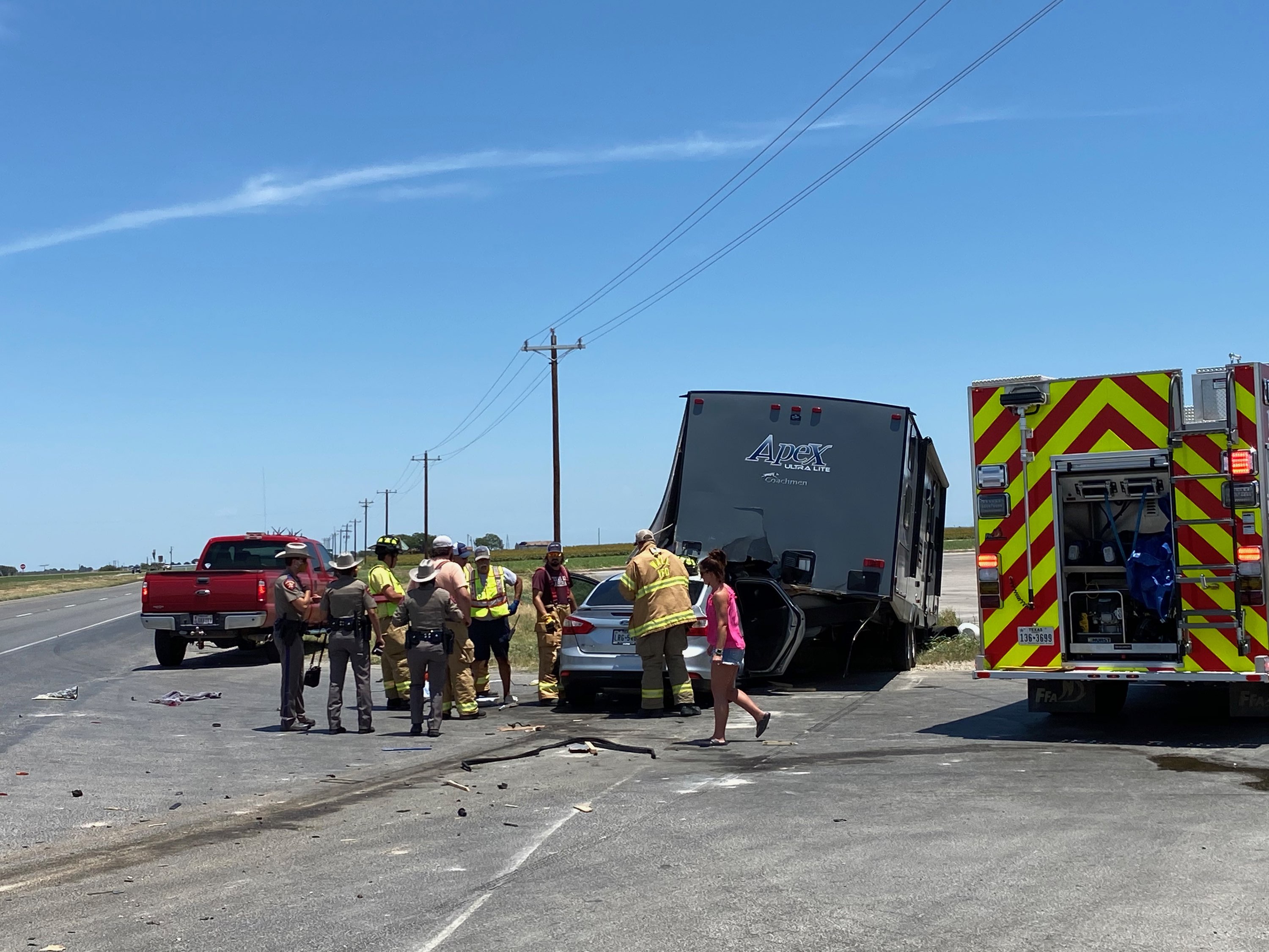 It appears a vehicle pulling the travel travel trailer may have been entering or exiting the convenience store parking lot and was struck by the white car traveling south on U.S. 87 but that has not been confirmed by DPS investigators.