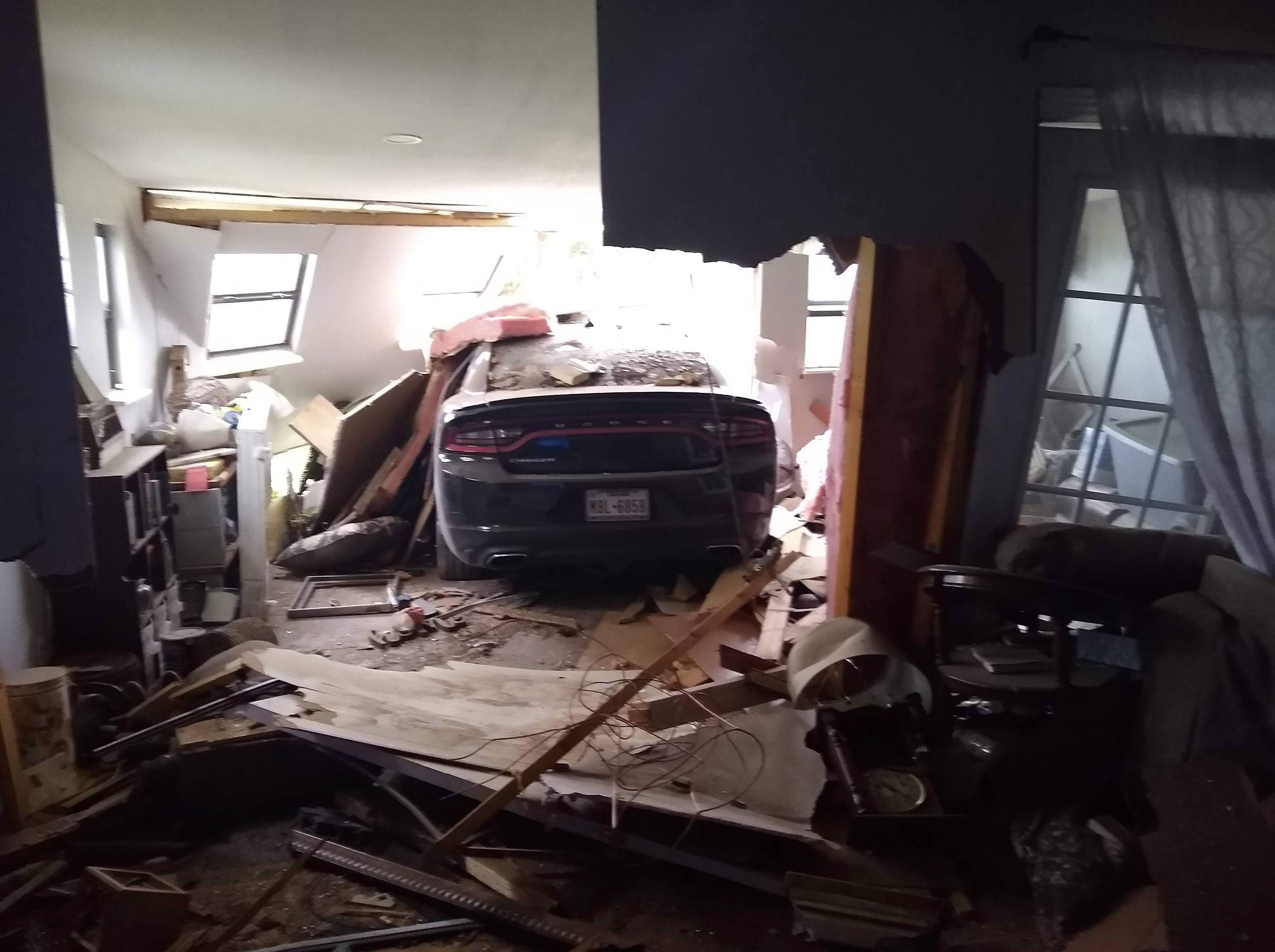 Not much can be seen from the road Sunday morning, but inside, the car is still there, with its front end sticking out the back wall into the backyard. Kaitie said the car tore through two load-bearing walls and the roof is sagging. The house is no longer safe to be inside, she said.