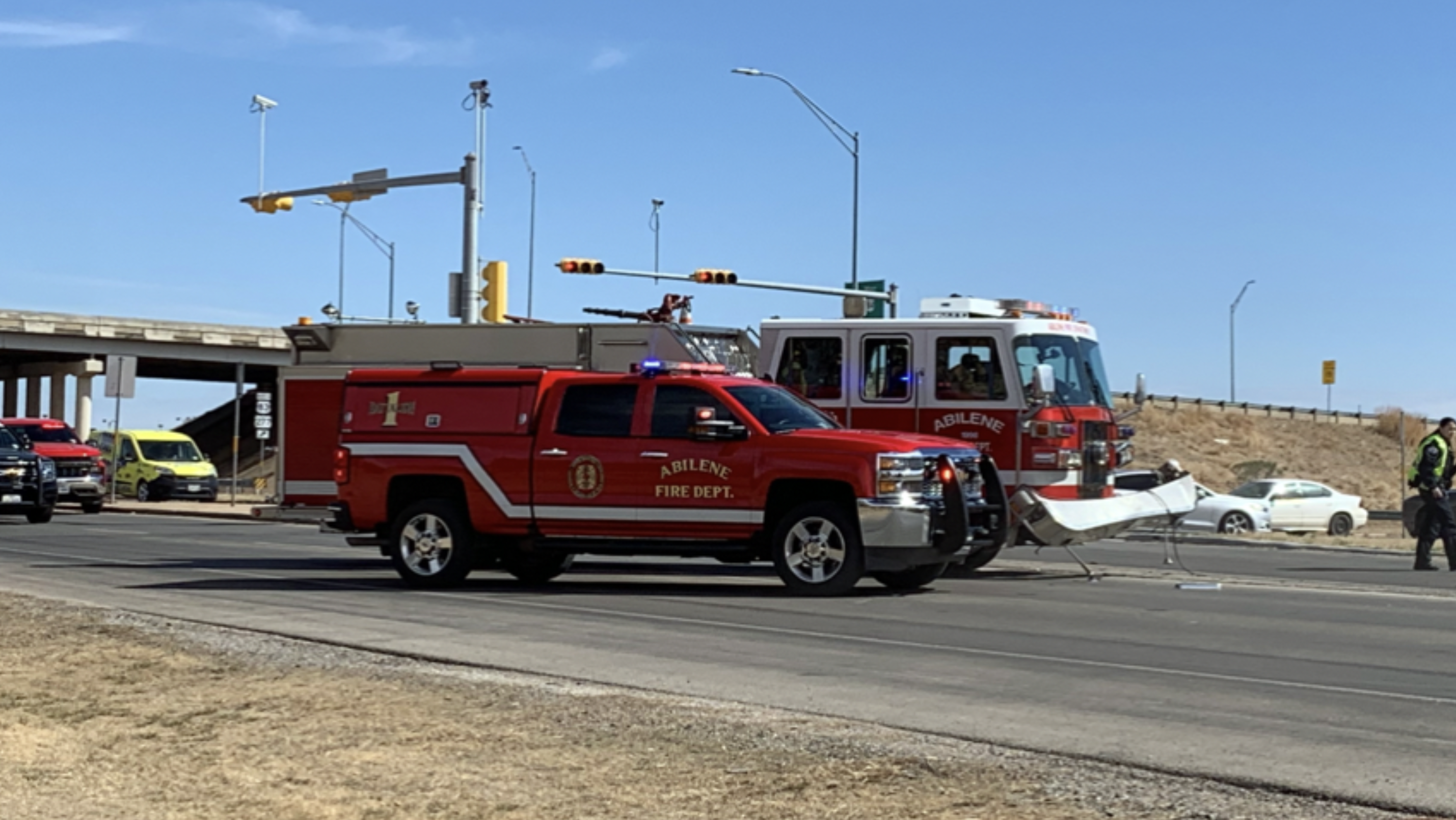 According to reports, about 2:30 p.m. Monday afternoon, Abilene emergency crews responded to a crash at South First Street and Danville Drive involving a Dodge Challenger and Engine 7 of the Abilene Fire Department.