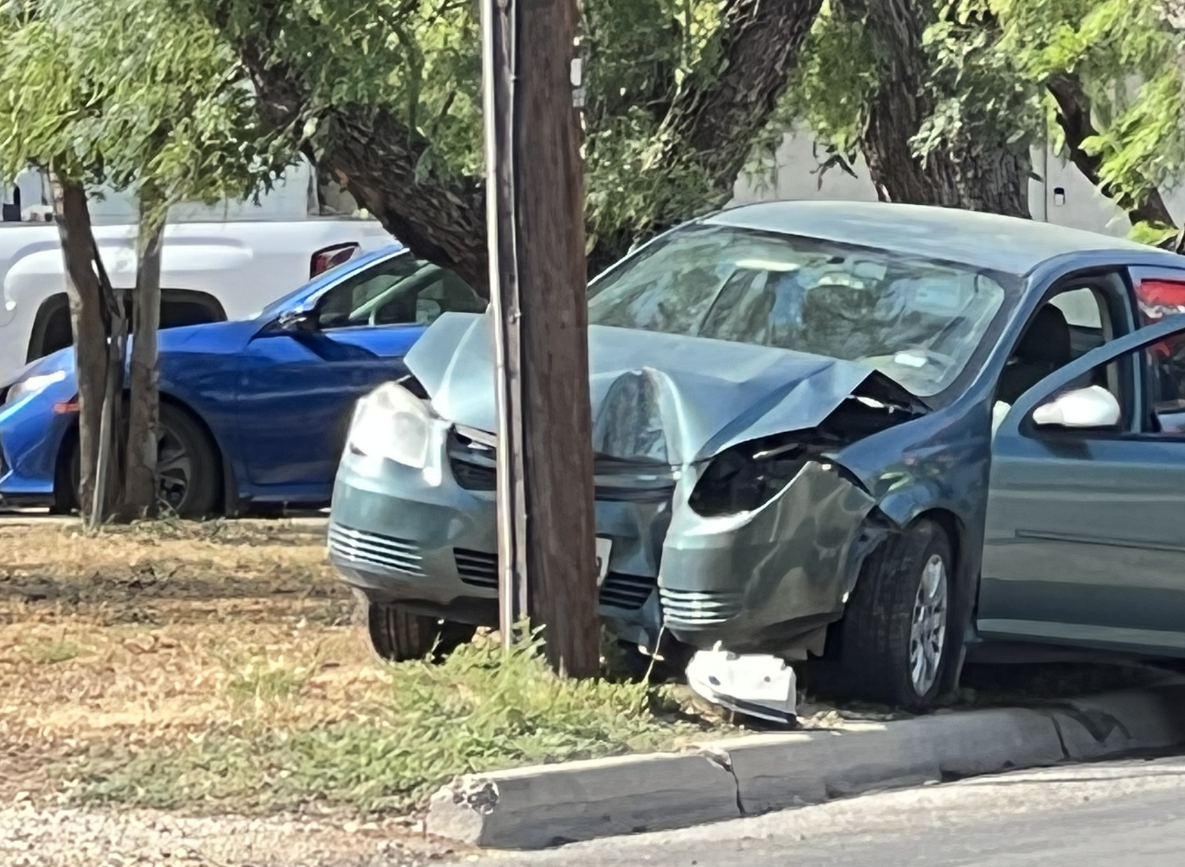 When they arrived, the crew discovered a silver passenger car that had crashed into a telephone pole.