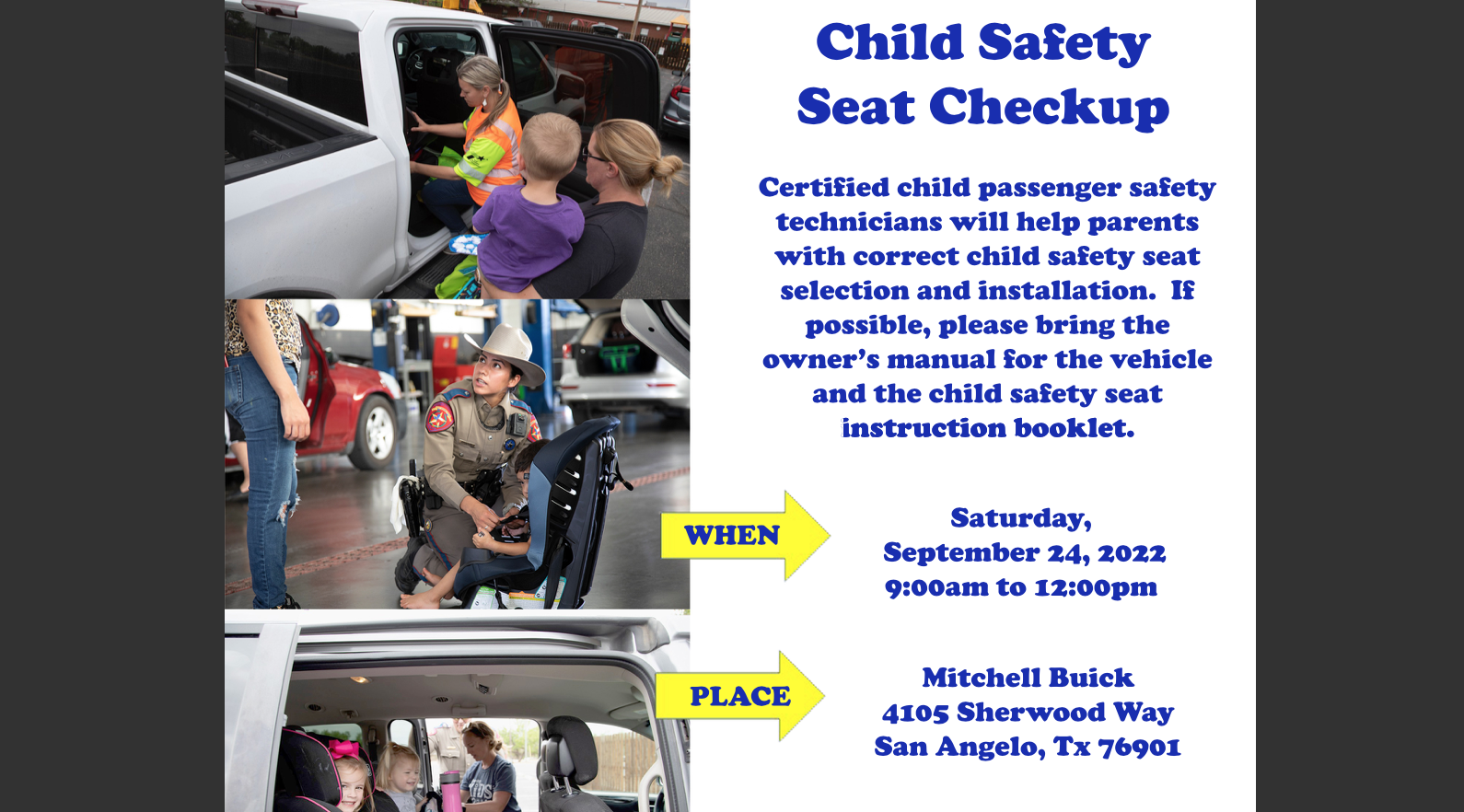 The San Angelo TxDOT Office is hosting a Car Safety Seat Checkup this Saturday, Sept. 24, 2022 at Mitchell Buick GMC 4105 Sherwood Way from 9 a.m. to noon. The checkup is free.