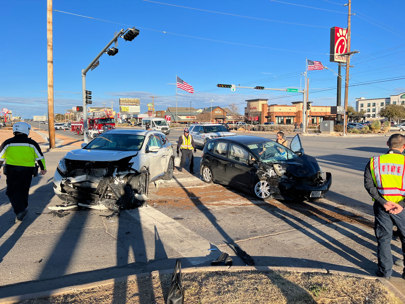 SAN ANGELO, TX — A driver and passenger were trapped when first responders arrived at Knickerbocker at S. Jackson Friday afternoon involving three small and imported SUV type vehicles. The crash impacted traffic headed to the Cane’s Chicken and the Rosa’s Mexican Cafe on the north side of the intersection known as “The Chicken District.” Traffic headed to the Chick-Fil-A and the Taco Bell were generally unaffected by this crash since both establishments were across the street.