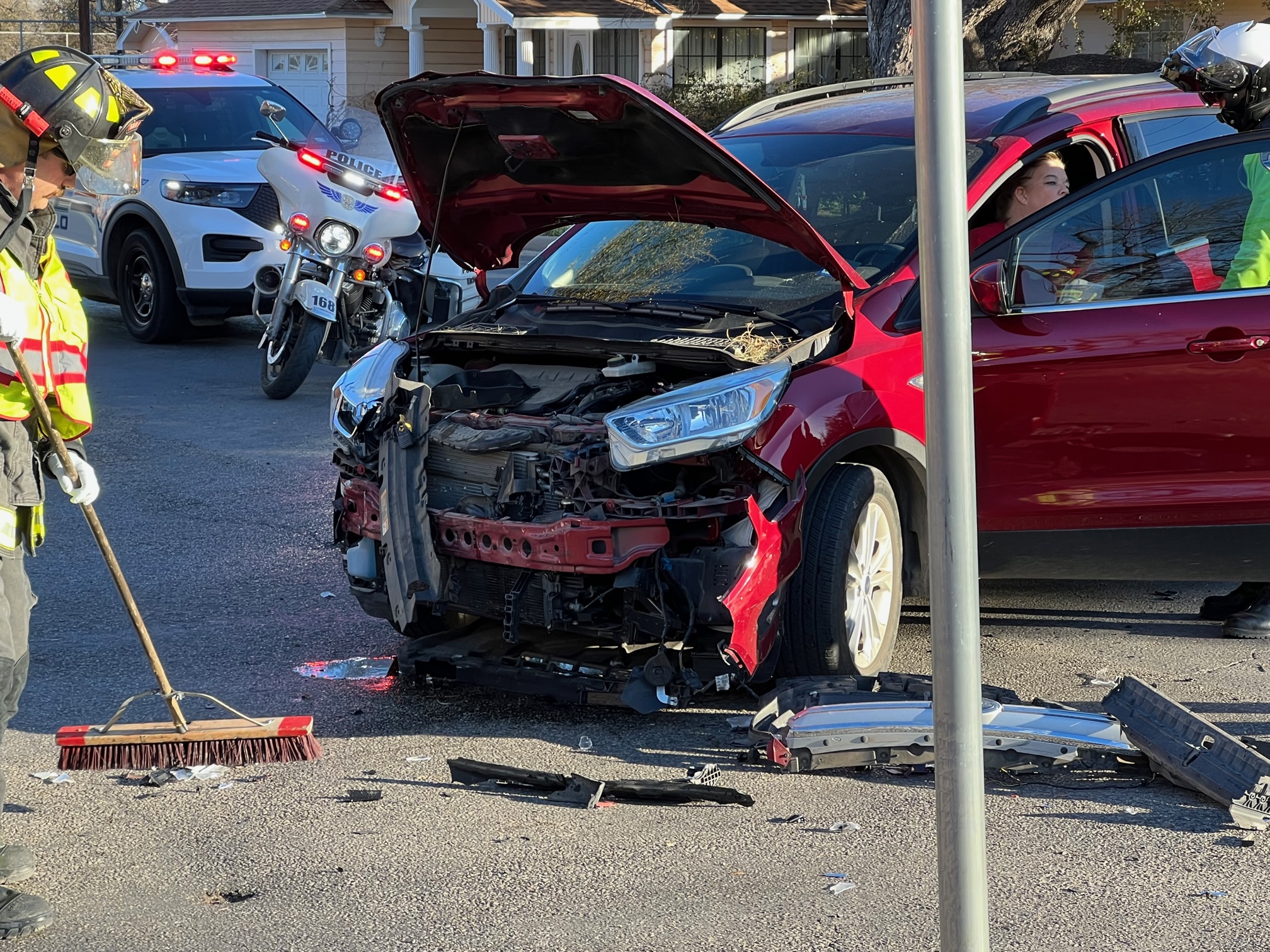 A red Ford Escape SUV and a brown Toyota Tundra pickup crashed at the intersection of Johnson St. and Live Oak Monday morning. San Angelo Police and Firefighters were dispatched to a rollover crash around 8 a.m. Monday.