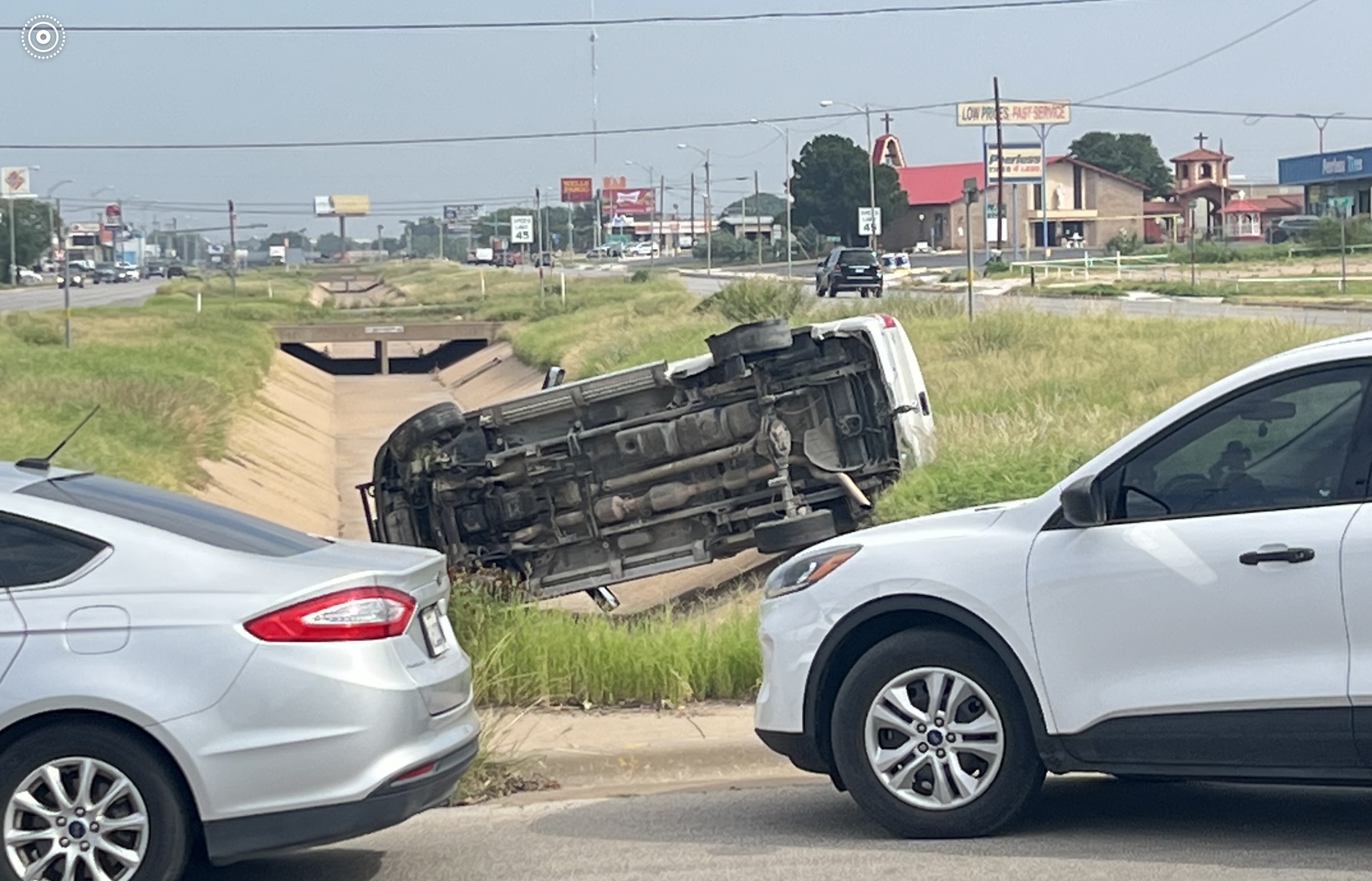 A white pickup with flattened tires and lots of damage can be seen on its side. SAPD officers are on the scene along with other law enforcement. San Angelo Police issued a Nixle alert at 9:57 a.m. instructing motorists to avoid the area because of reduced traffic.