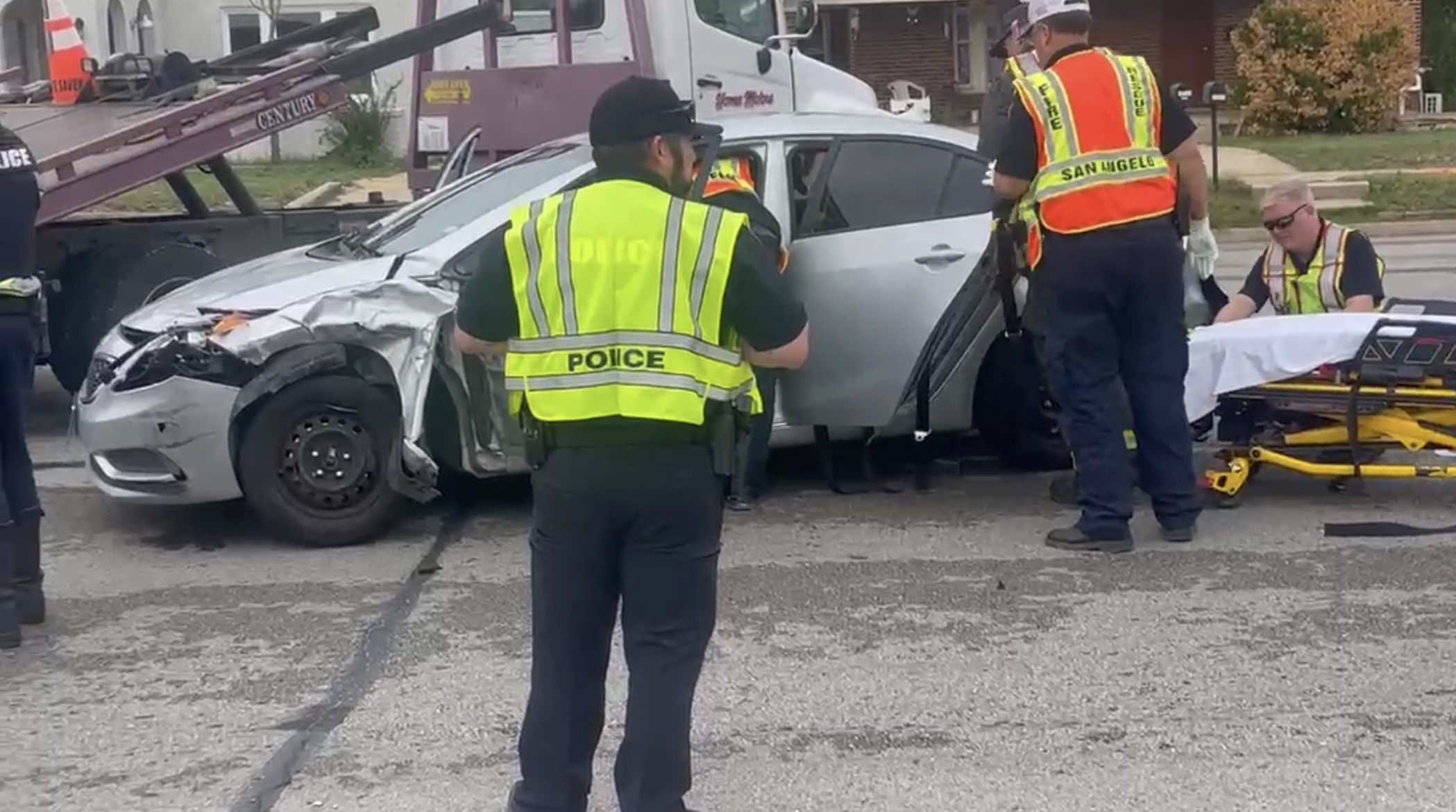 The vehicles in question involved a red F-150 and a gray Kia Forte which were both headed south bound. According to the San Angelo Police Department officer on the scene, a witness said that the Kia Forte made an unsafe lane change and side swiped the Ford truck. After they collided, both vehicles spun around and then came to a stop, sending debris scattered throughout the street.