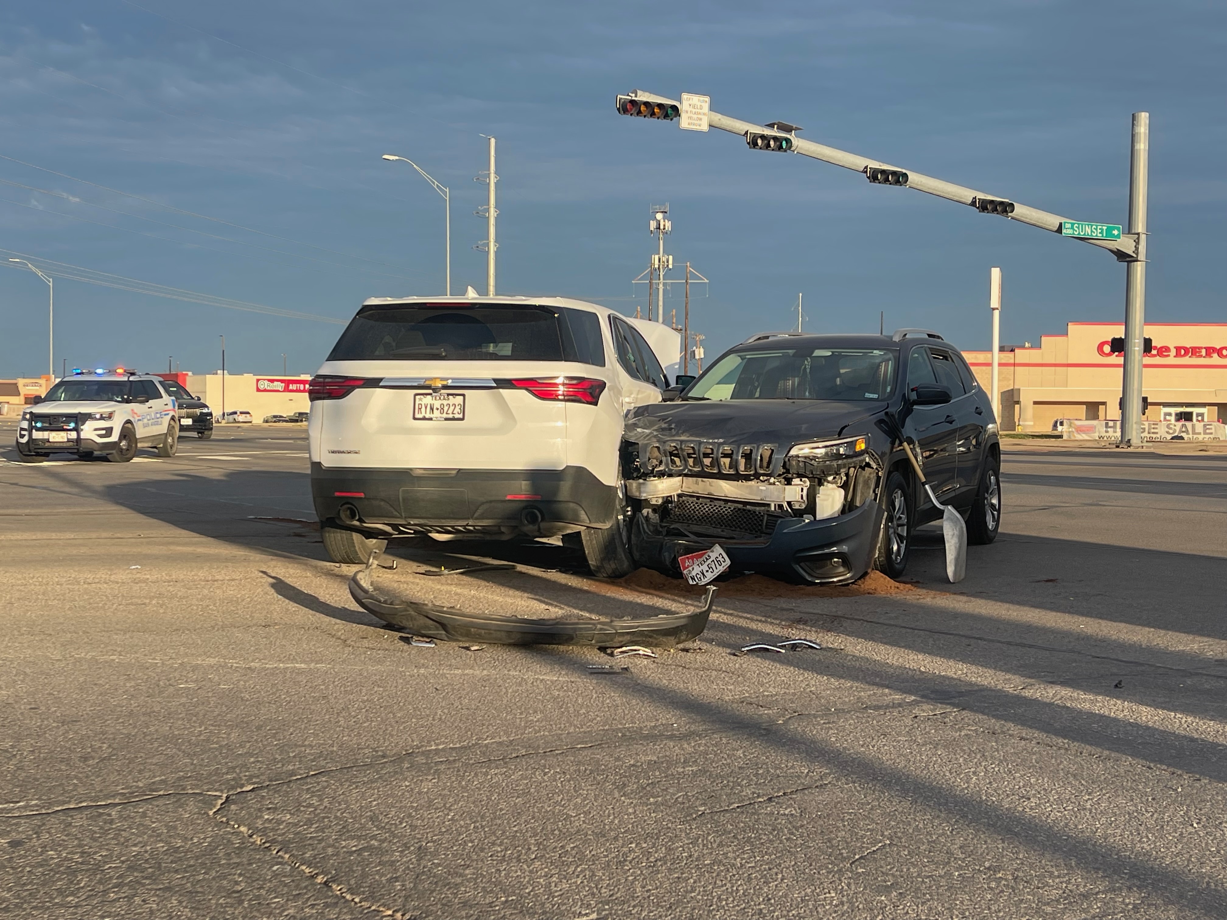 San Angelo police traffic investigators reported that the driver of the white Chevrolet Traverse was traveling eastbound on Sherwood Way when she made a left turn onto Sunset without yielding to oncoming traffic, causing the collision. Traveling westbound was a 66-year-old man with a 68-year-old woman as his passenger in a green Jeep SUV. The two vehicles collided in the middle of the westbound lanes, resulting in a traffic bottleneck.