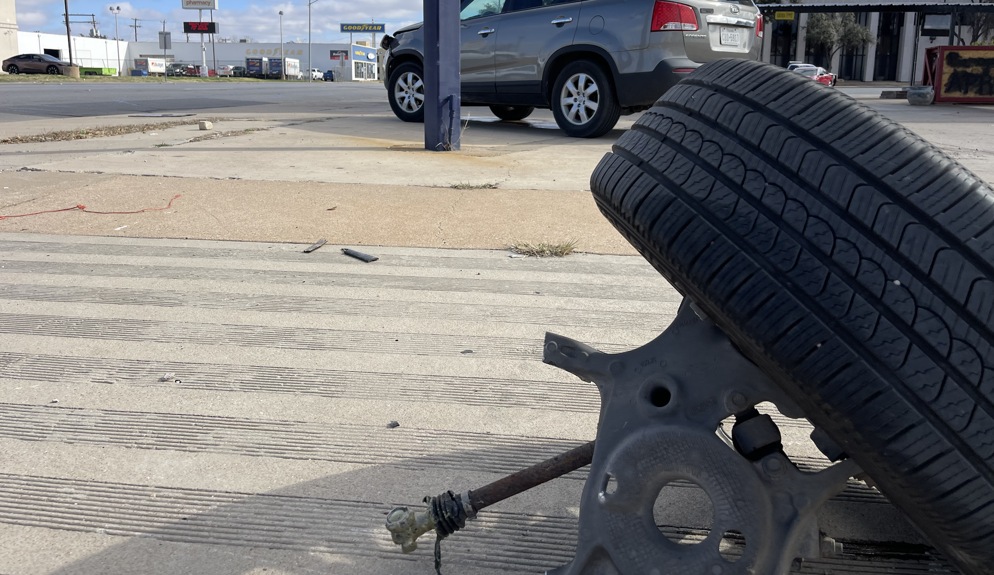 SAN ANGELO, TX — A crash between a white Lincoln Nautilus and a grey Kia SUV tore off a wheel and left it near traffic on Wednesday morning, February 14.