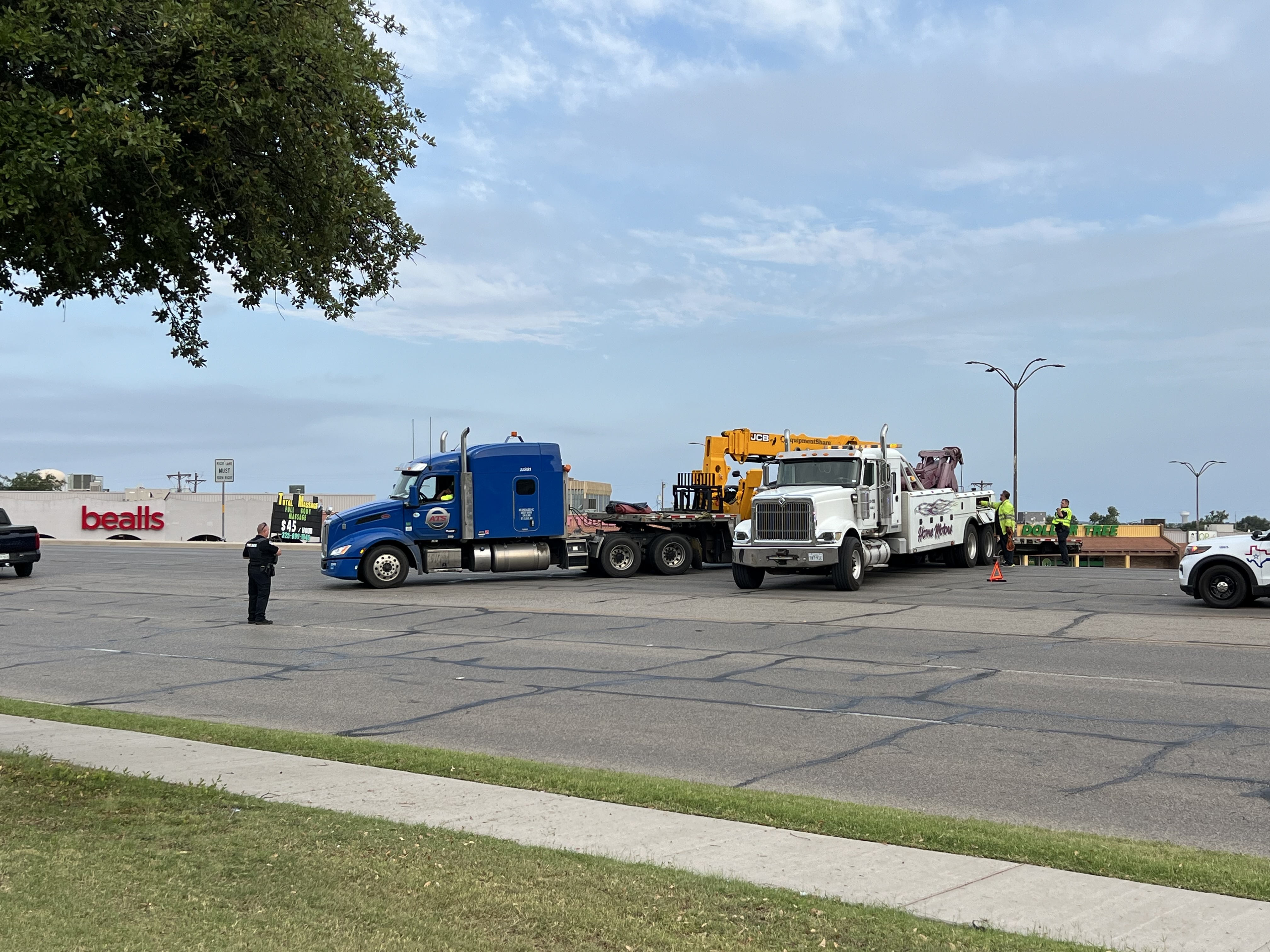 SAN ANGELO, TX – A semi-truck with a lift onboard its trailer bottomed out while exiting the Southwest Plaza Shopping Center blocking both westbound lanes on Knickerbocker Road.