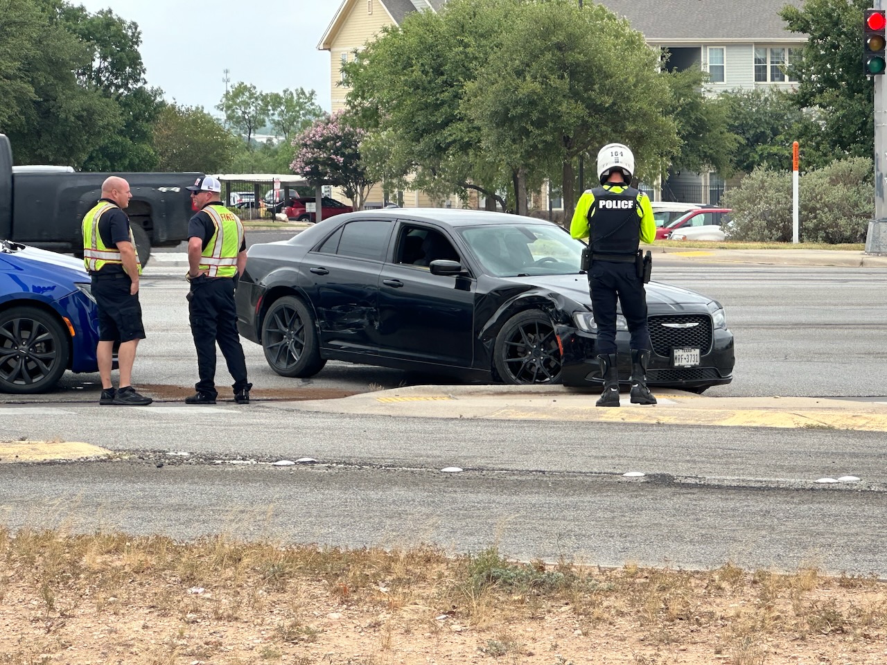 SAN ANGELO, TX — Two Chryslers collided on Knickerbocker Road at University Avenue at 12:15 p.m. Thursday. The damage appeared moderate. One block southwest on Knickerbocker are the chicken restaurants Cane's and Chick-fil-A, hence this part of town is often referred to as "The Chicken District." Taco Bell and Rosa's, on opposite corners, also sell a high volume of chicken.