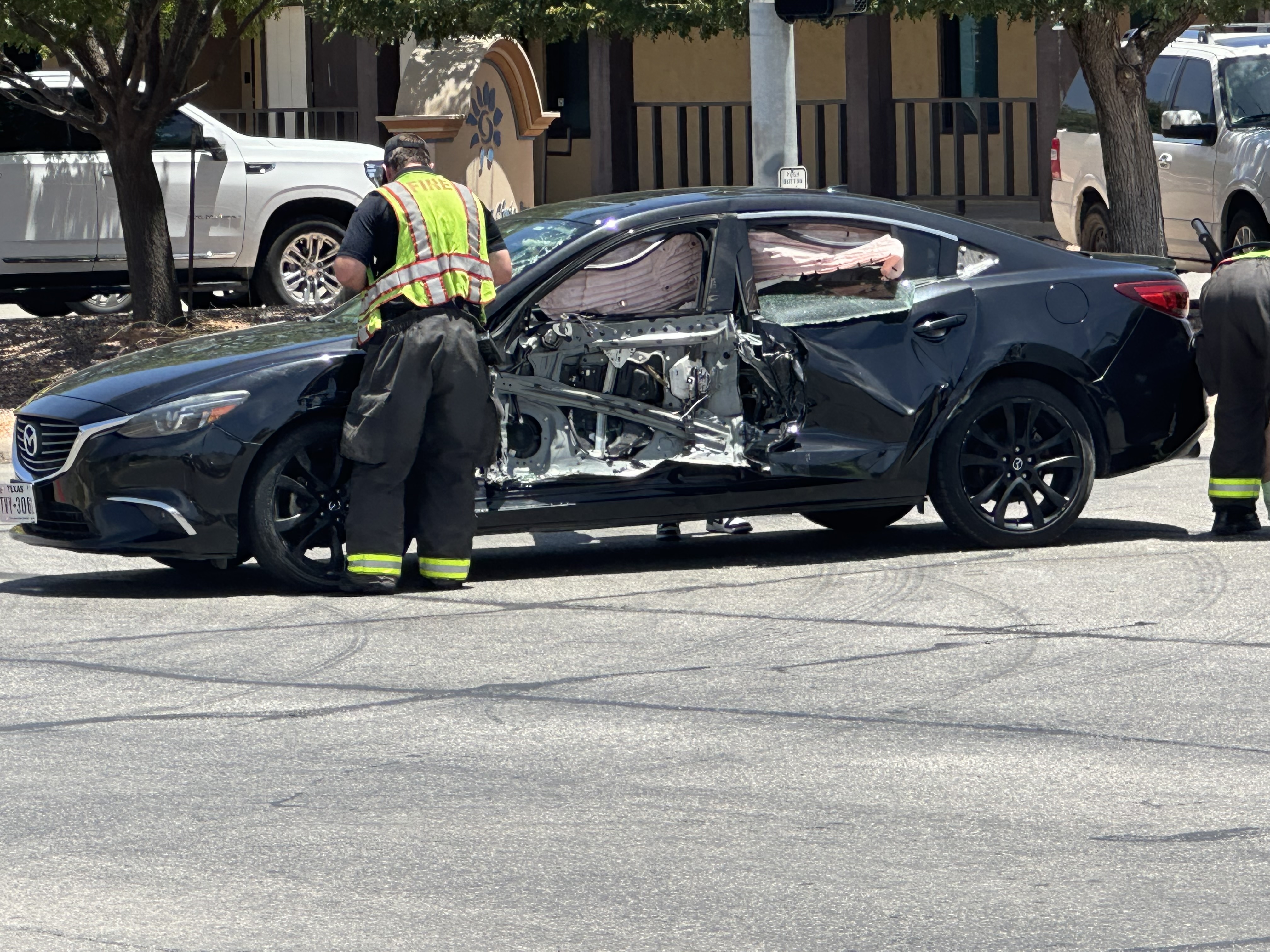 A black Mazda sedan was struck by a white Ford pickup, leading to traffic disruptions as first responders investigated the scene. Authorities redirected traffic to manage the flow.