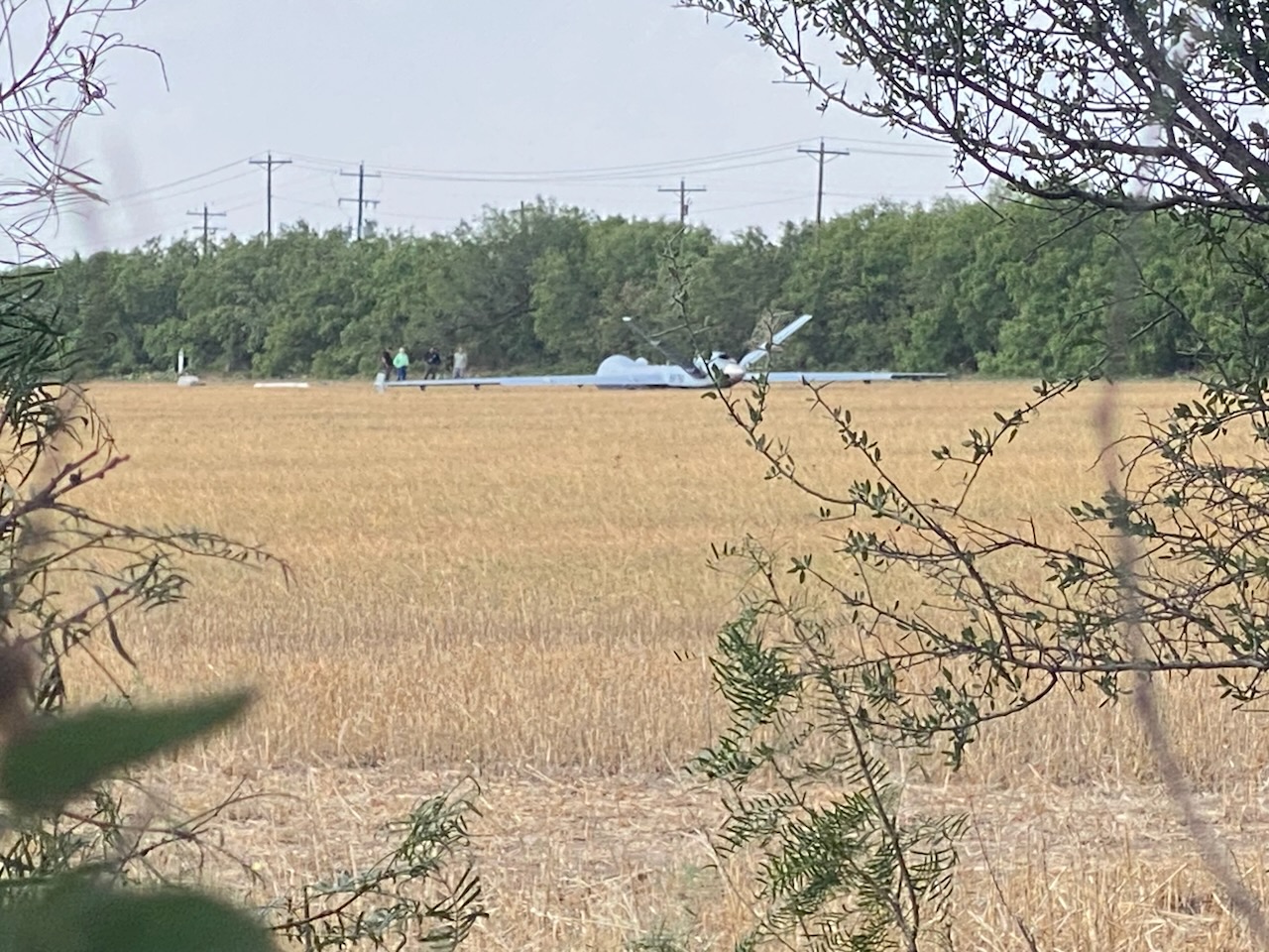 SAN ANGELO, TX — A Customs and Border Protection (CBP) MQ-9 UAS (Unmanned Aerial System) — or drone — crash-landed south of Goodfellow Air Force Base off South Gas Plant Road at around 3 p.m. Sunday, July 14, 2024. The MQ-9 operation is based at San Angelo’s Mathis Field, the municipal airport. Goodfellow AFB's runways have been closed for decades.