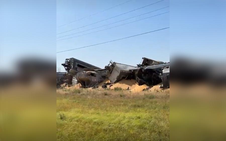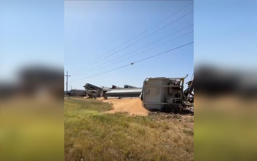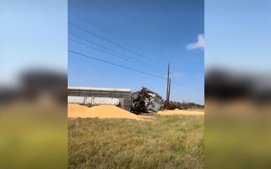 This happened around 10:30 a.m., involving what appears to be 20 or more train cars hauling corn.