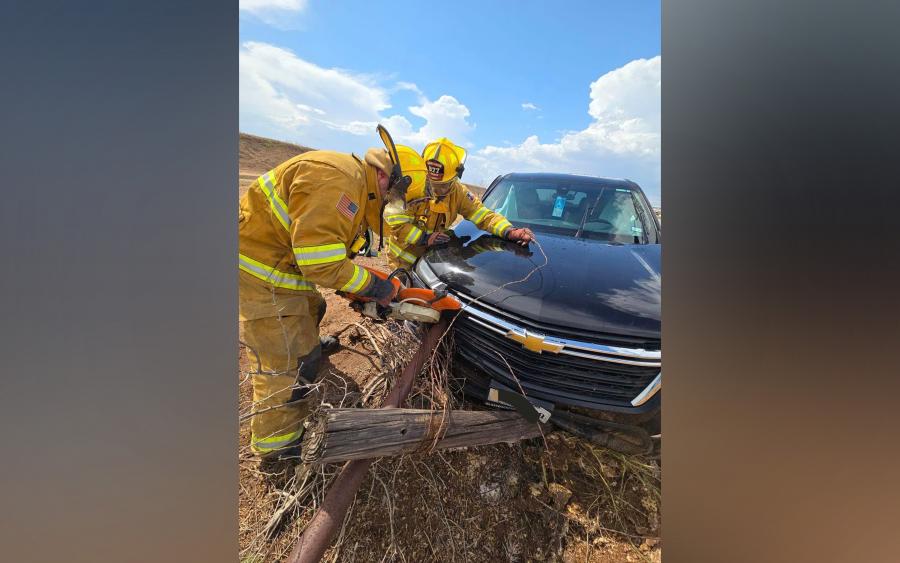 Upon arrival, they found a vehicle that had left the roadway and crashed into a pipe fence, which penetrated the vehicle. It was reported that the pipe missed all occupants by inches.