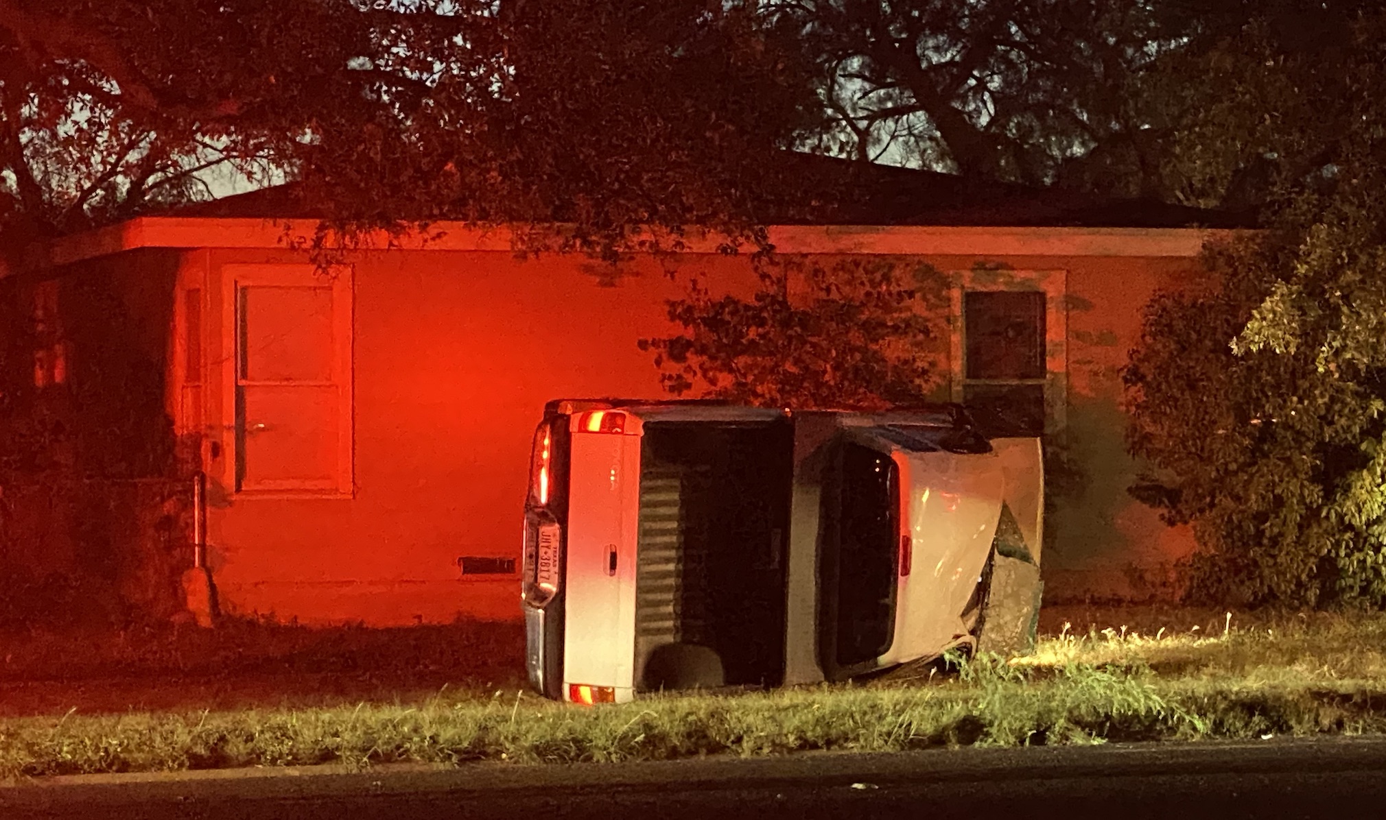 At around 8:35 p.m., a two-vehicle crash ended with a white truck on its side in the yard of a San Angelo resident and another black SUV with its front end torn off. According to the San Angelo Police Department, the SUV attempted to pull out of the San Angelo Stadium parking lot moving south on Johnson St., but failed to yield the right of way to the white truck already traveling southbound on Johnson St.