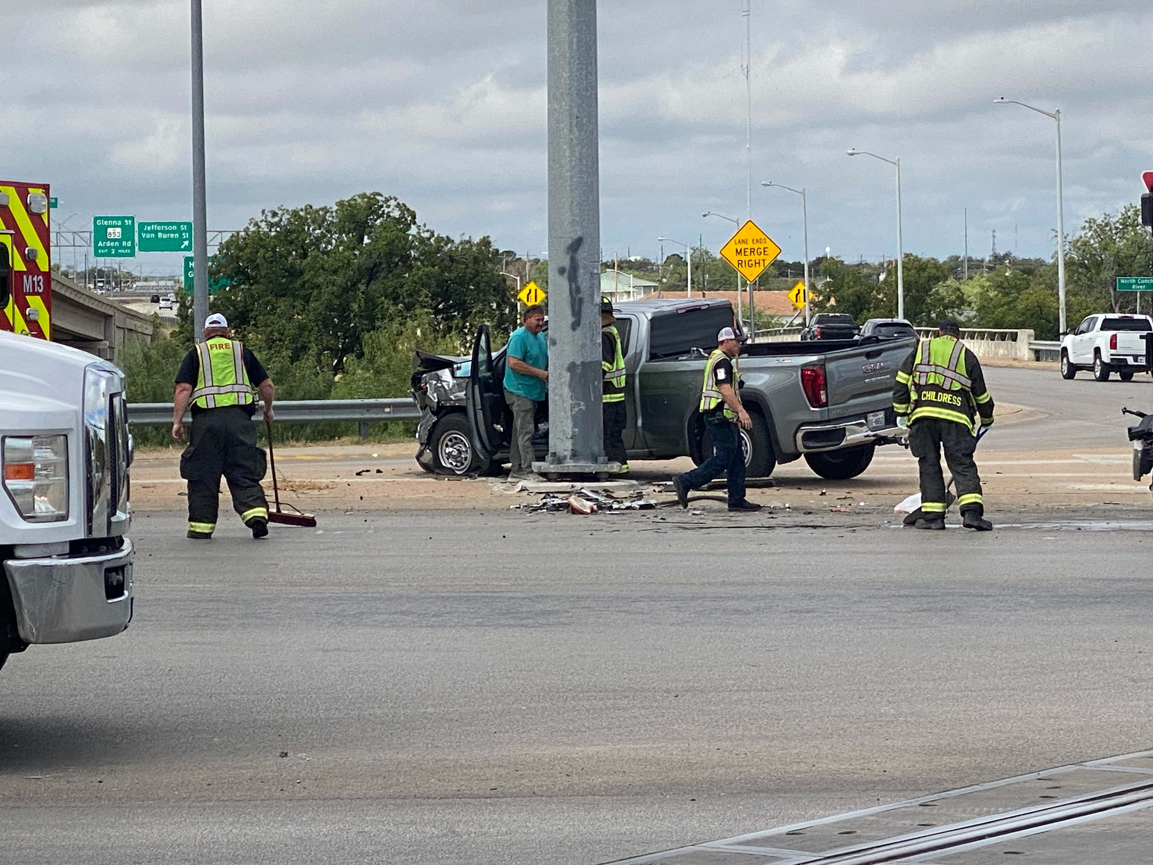 A black Ford F-150 hauling a trailer collided with a grey GMC Sierra at Bryant Boulevard and the Houston Harte frontage road. It's unclear which driver was at fault.