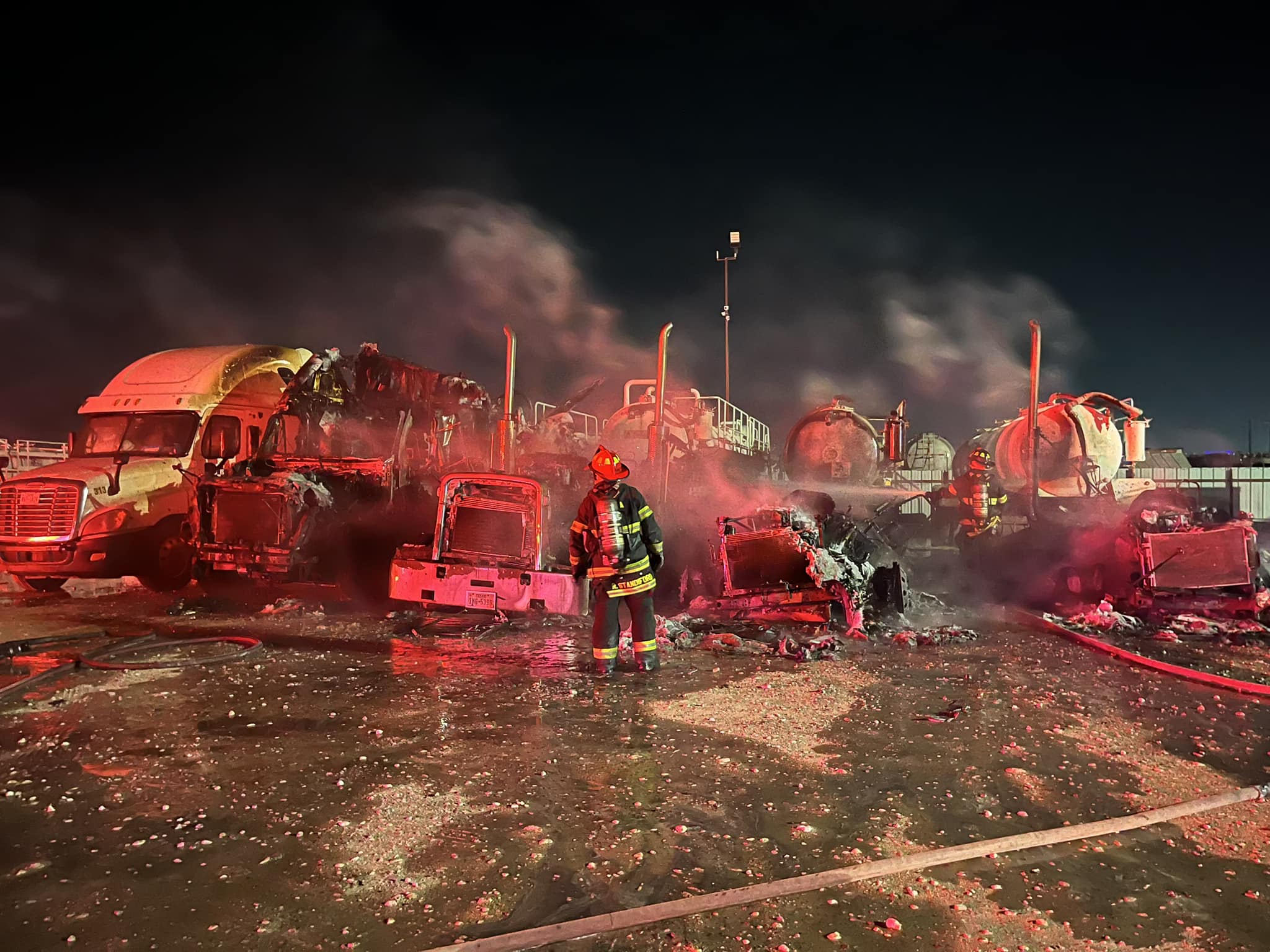 ODESSA, TX — Odessa Fire Rescue responded to a fire early Saturday morning on the 2600 block of Charway Road, where four tractor-trailers were found engulfed in flames, with a fifth vehicle starting to ignite.