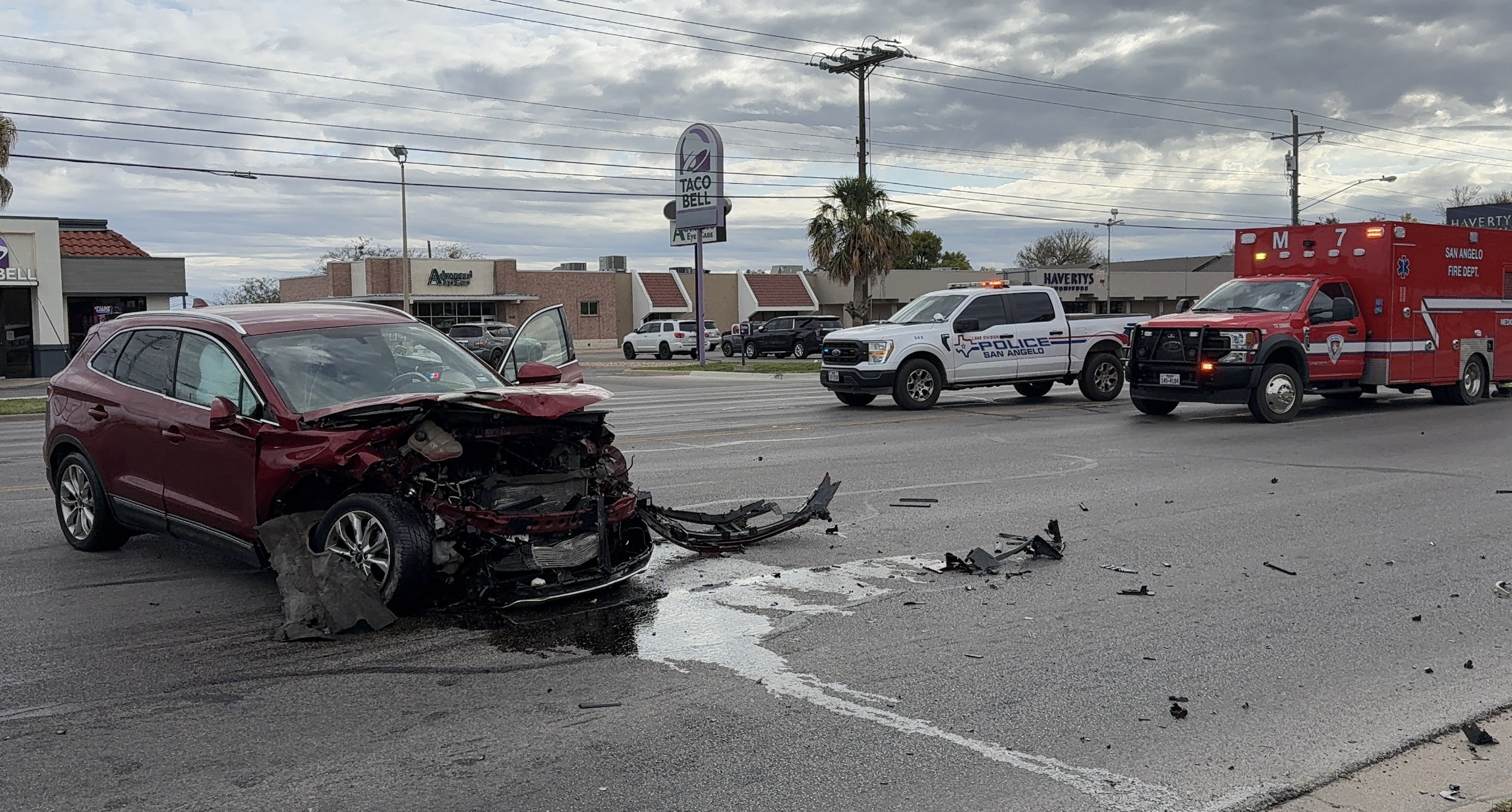 According to San Angelo Police, a white Kia Forte was driving westbound on Knickerbocker Road and a red Lincoln was driving eastbound on Knickerbocker Road. The Lincoln was turning left onto South Jackson Street and was struck by the Kia Forte. The light from Knickerbocker was red and the Kia disregarded the light, striking the Lincoln.
