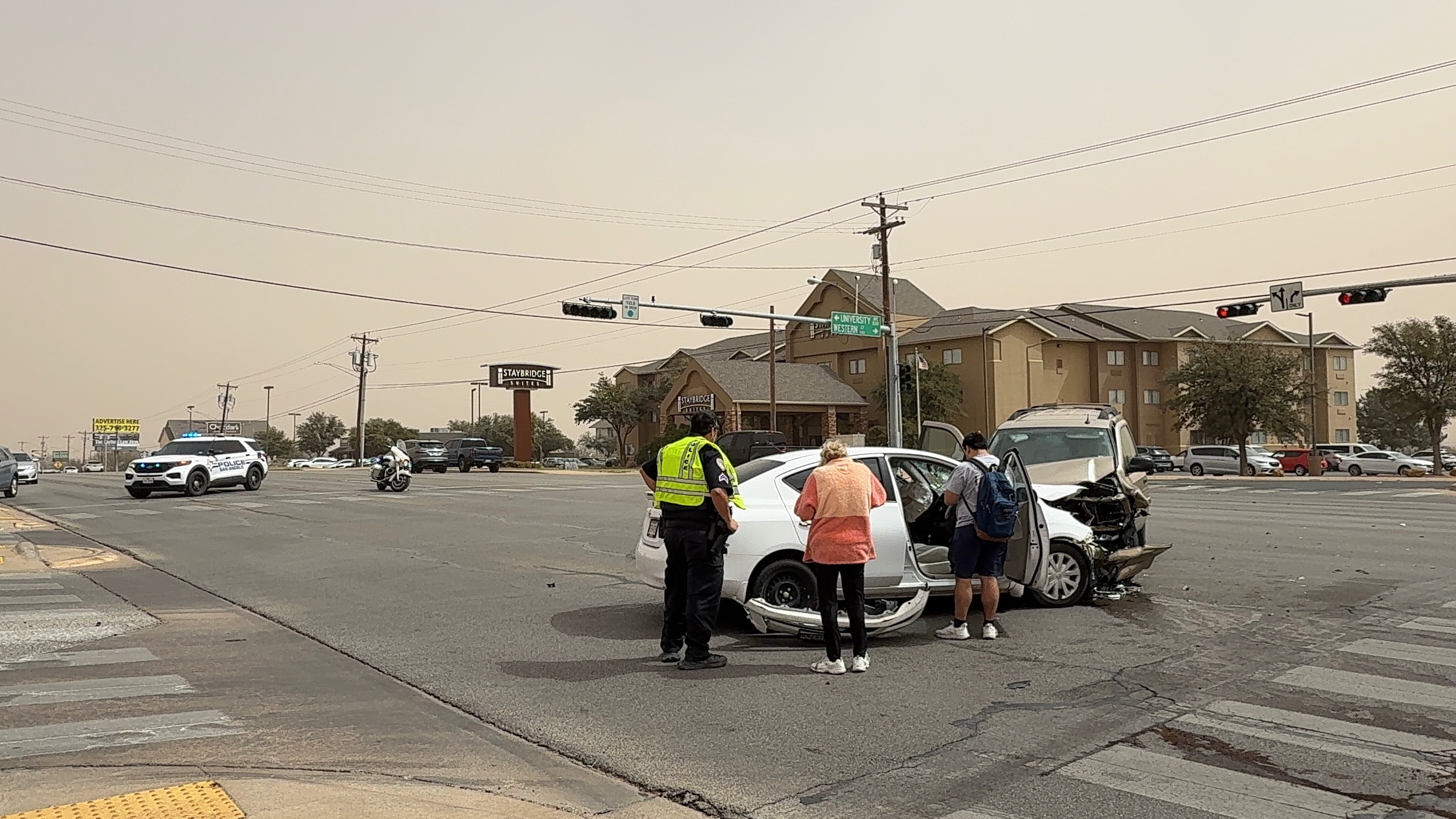 Traffic heading southwest on Knickerbocker was diverted onto University as officers worked the scene. The crash occurred just before 1 p.m. amid strong winds and blowing dust.