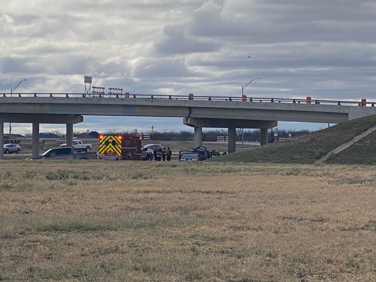 Authorities were alerted via radio to a possible fatal crash involving a pickup truck that collided with a highway bridge pillar. Initial reports indicated the crash could be fatal, though official confirmation was not immediately available.