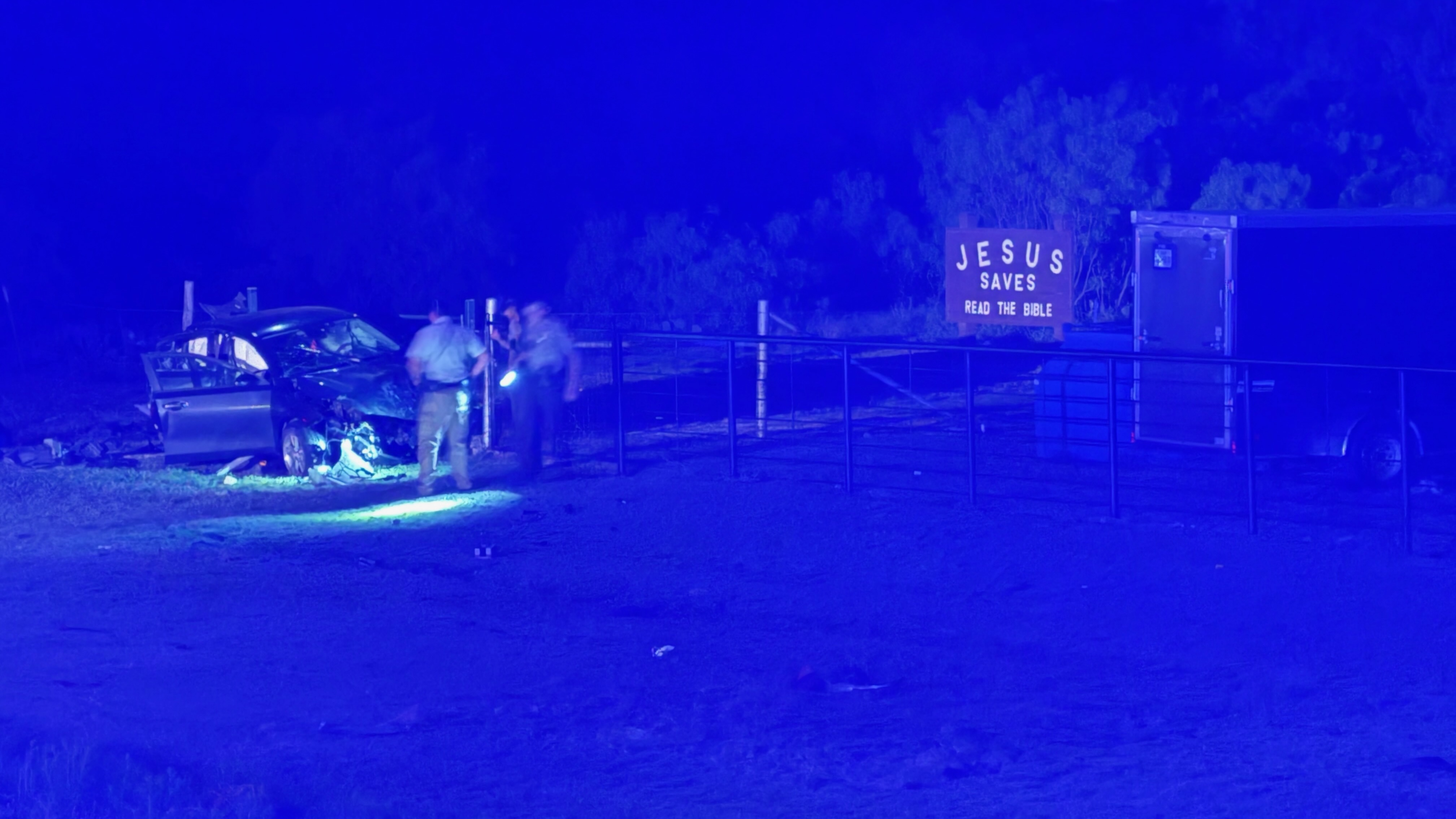The vehicle came to a rest beneath a roadside sign that read, “Jesus Saves,” with a smaller message below it: “Read the Bible.” The crash happened at around 11 p.m. on Friday night, April 11, 2025.