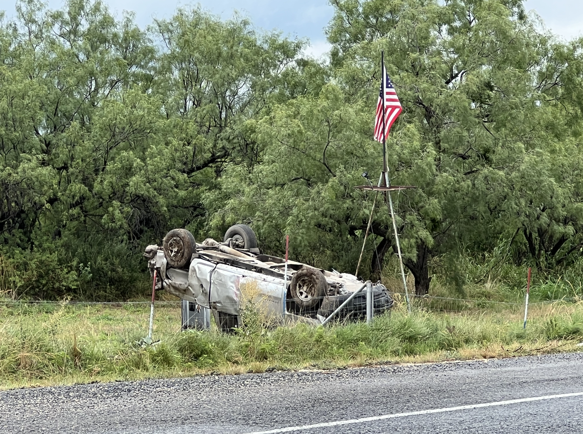 The car involved in the crash was left lying upside down off of the road.