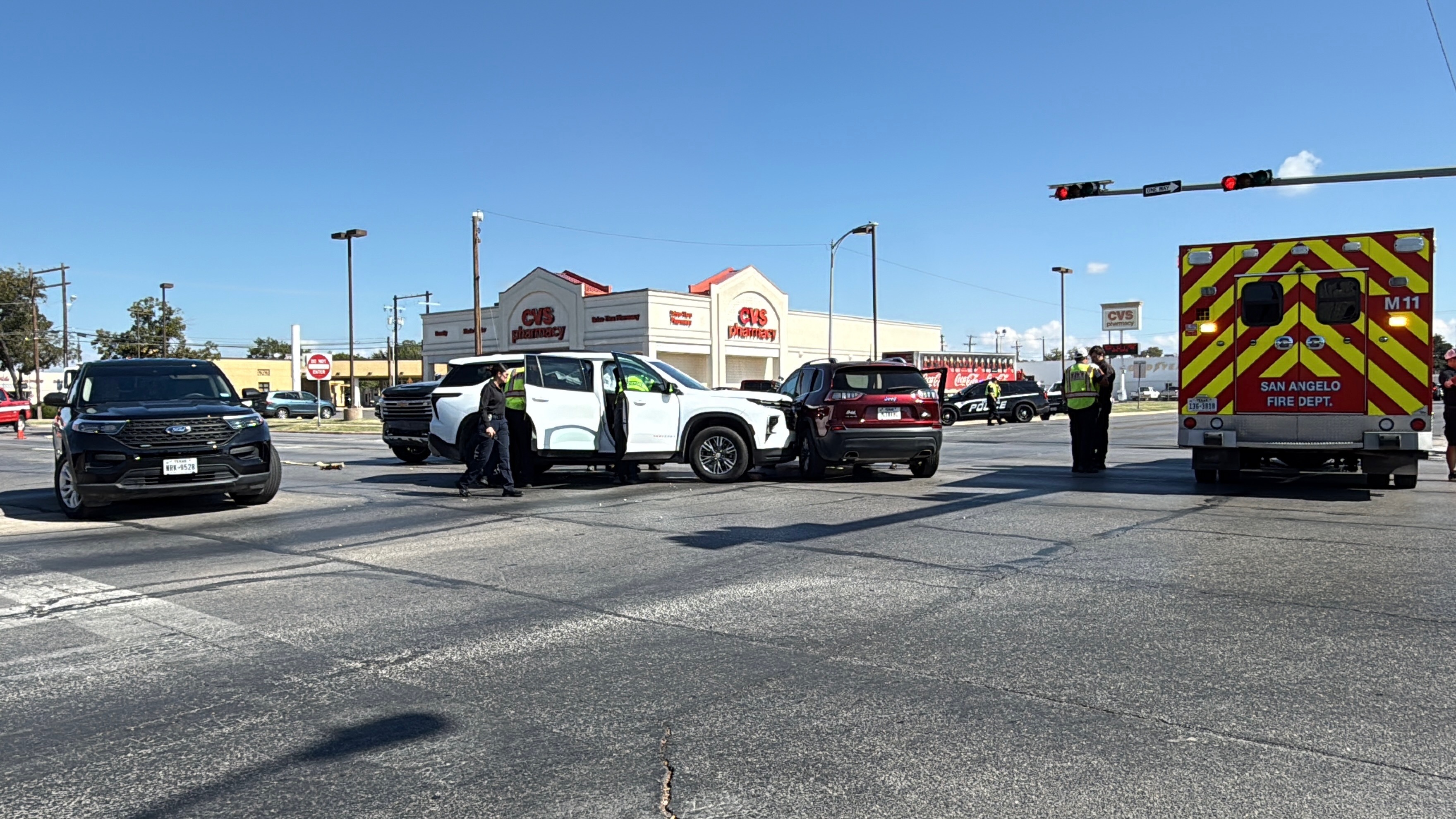 SAN ANGELO, TX — A three-vehicle crash just before noon Thursday has shut down one of the busiest intersections in San Angelo.