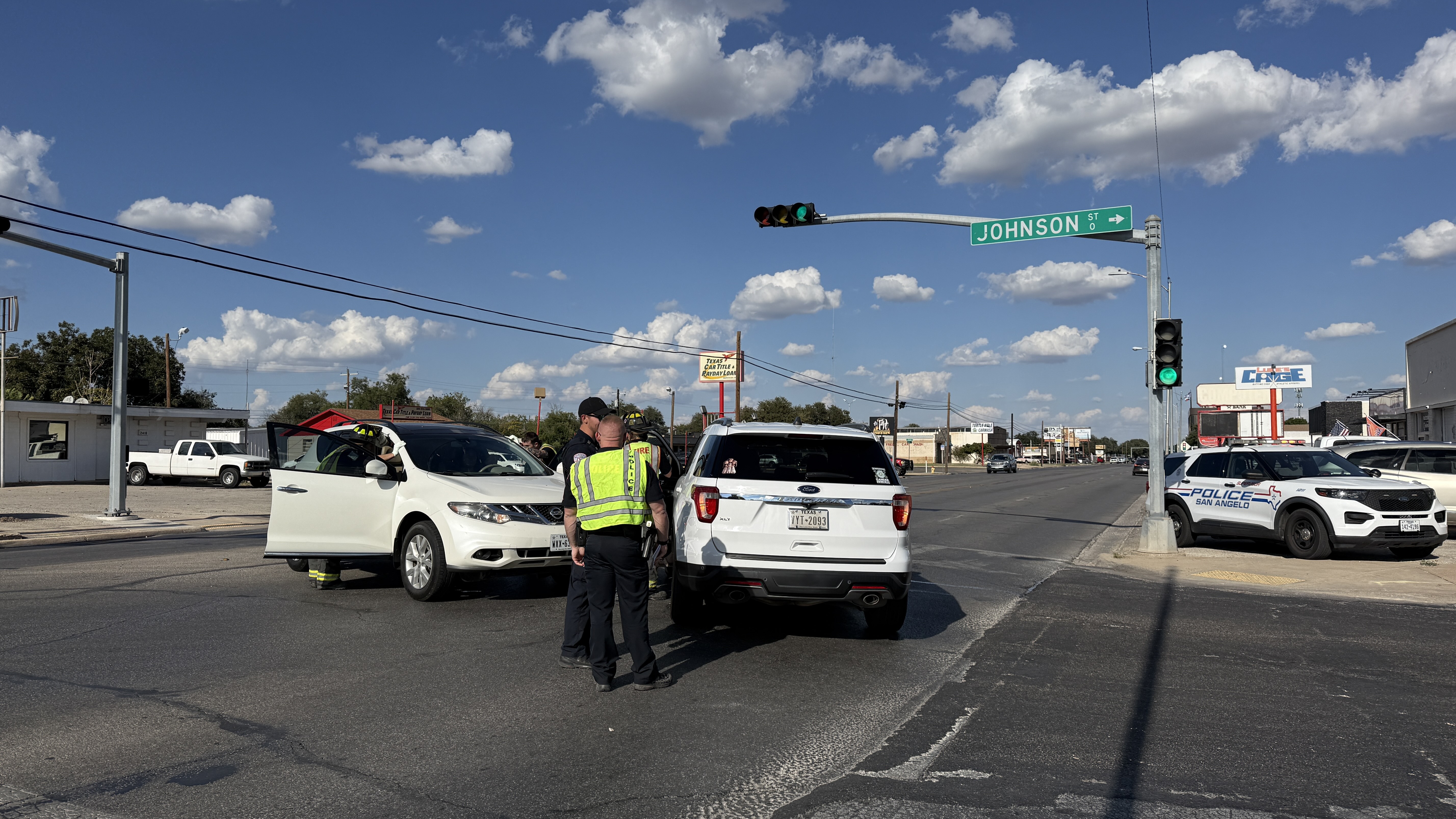 Photos from the scene show San Angelo police officers and firefighters assisting at least one person from a white Ford Explorer that collided with a white Nissan Murano near the intersection. One person from the Explorer went to the hospital for non-incapacitating injuries. Shortly after, another ambulance was called to the scene after the driver of the Nissan complained of head pain. She was then also transported to the hospital.