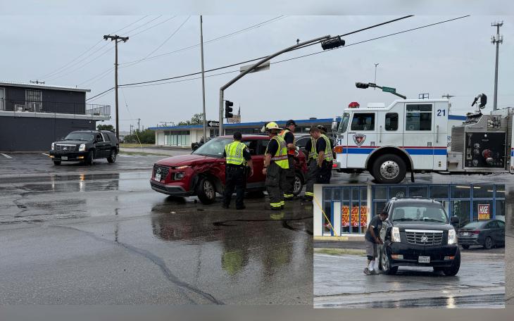 After a rain-soaked crash on Koenigheim Street, a man did just enough body work on his Cadillac to get it back on the road, while the other vehicle had to be towed.