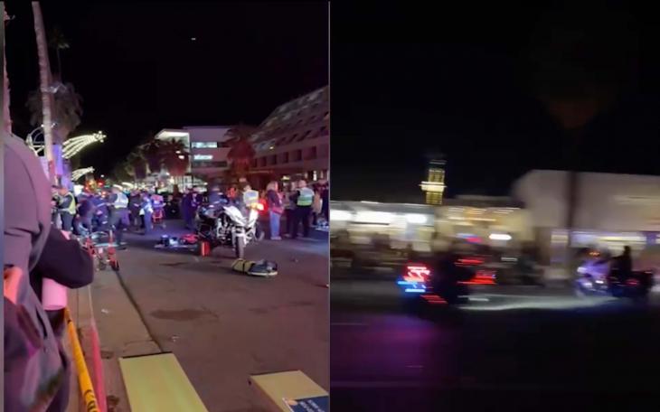 Ten people were injured Saturday night when a police traffic officer performing a wheelie on a motorcycle lost control and crashed into spectators during the Palm Springs Festival of Lights Parade, authorities said.