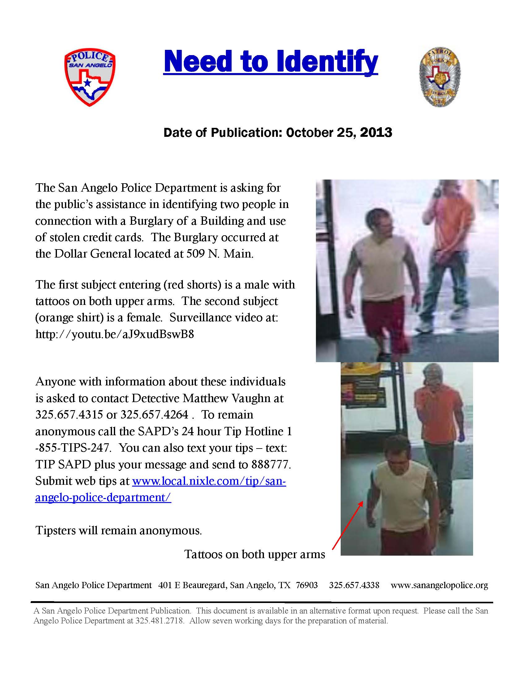 Anyone with information about these individuals is asked to contact Detective Mathew Vaughn at 325-657-4315 or 325-657-4264. To remain anonymous, call the SAPD's 24-hour Tip Hotline at 1-855-TIPS-247. You can also text your tips--text TIPS SAPD plus your message and send to 888777.