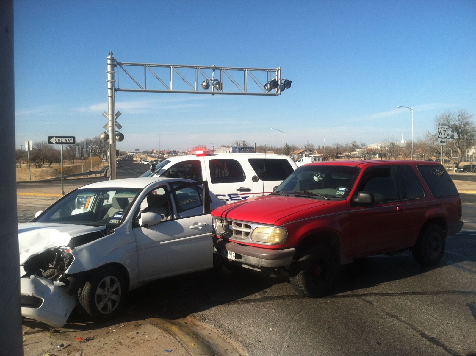 According to the investigating officer, the southbound white Honda car was stopped at the stop light, and when the light changed to green, the Honda proceeded through the intersection. Turning left was the red Ford Explorer as the light was changing. The Honda collided with the Explorer in the southbound lane on Bryant.