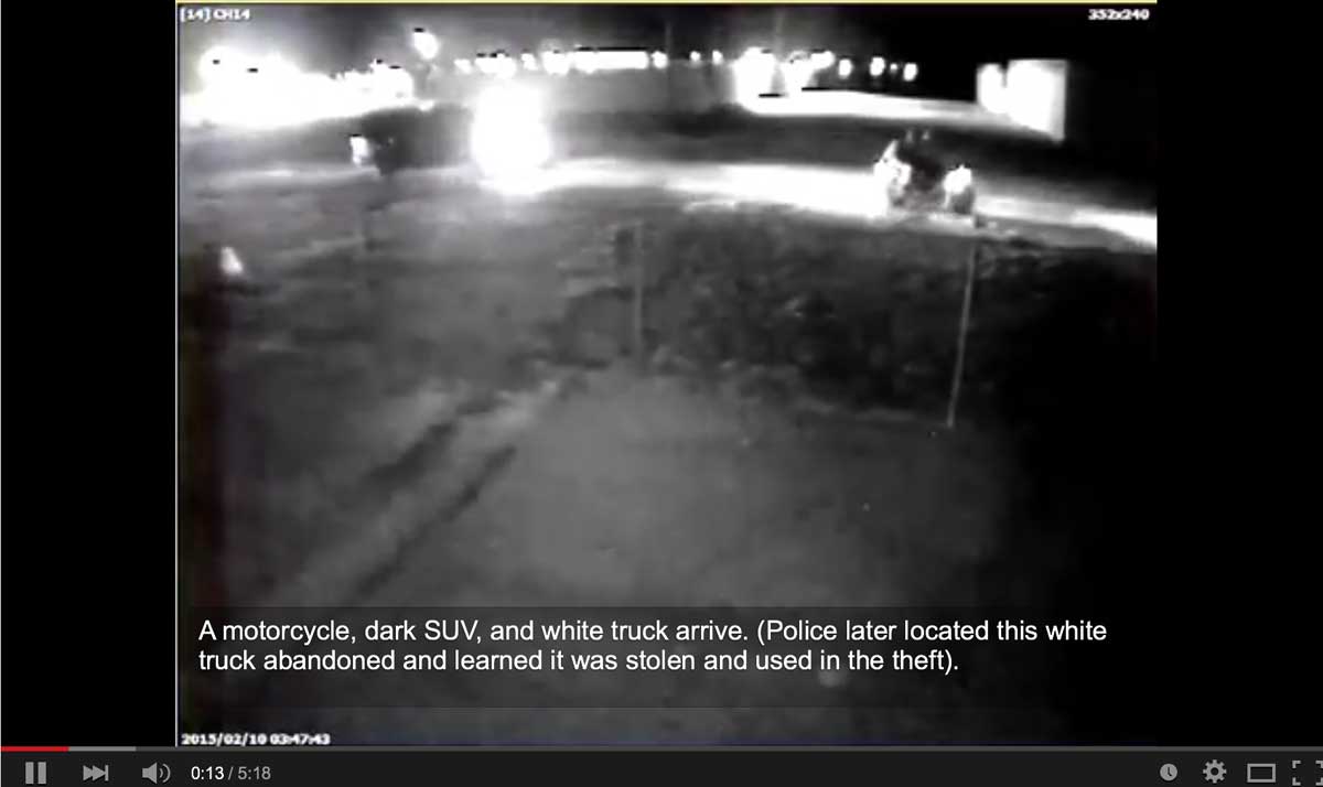 In the video, you can see a motorcycle, a dark colored SUV, and a white truck arrive to the location. The subjects drove off but returned a short time later. After the truck returned, the driver exited, cut the lock on the fence and drove inside. The SUV followed.