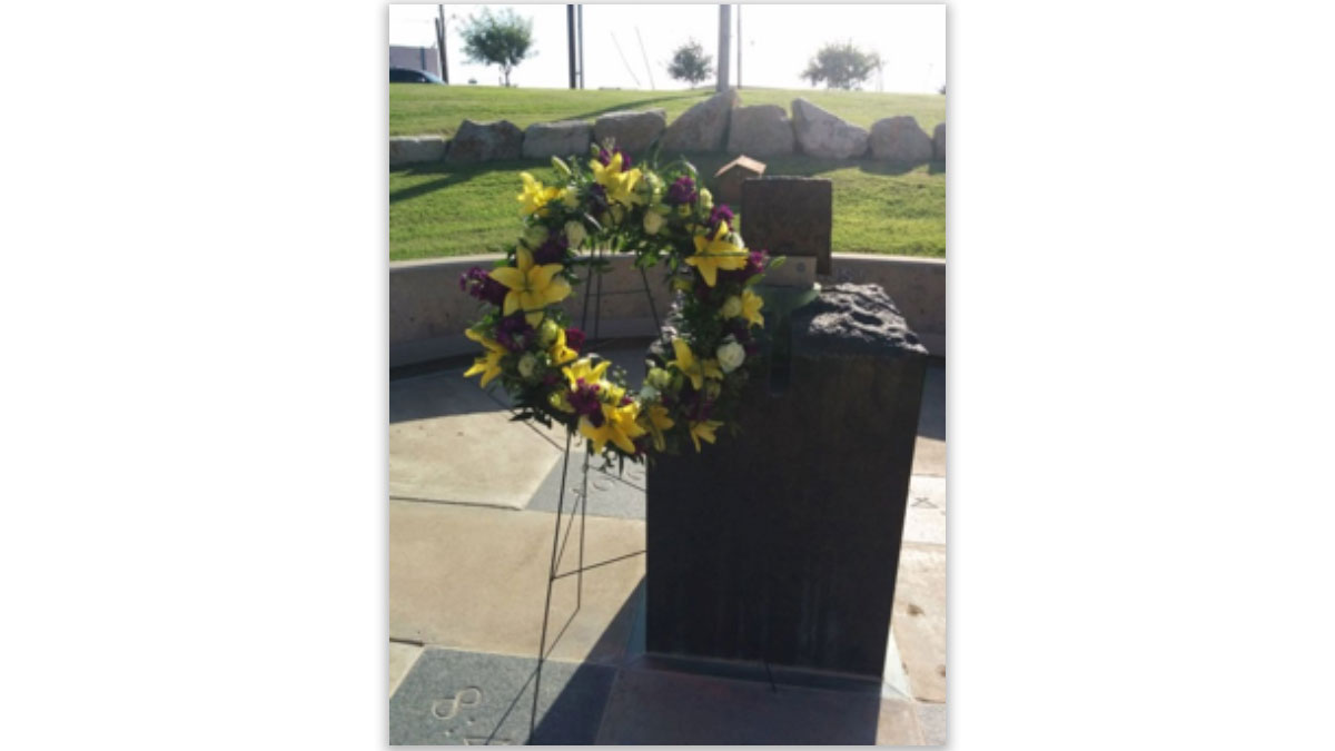 This monument, located right below the San Angelo Museum of Fine Arts, on the hill going toward the Celebration Bridge, was very unique in that it is one of the few in the state of Texas that was created using a piece of steel that was acquired from the World Trade Center, Ground Zero, in New York City. The piece of steel was stolen and the monument damaged.
